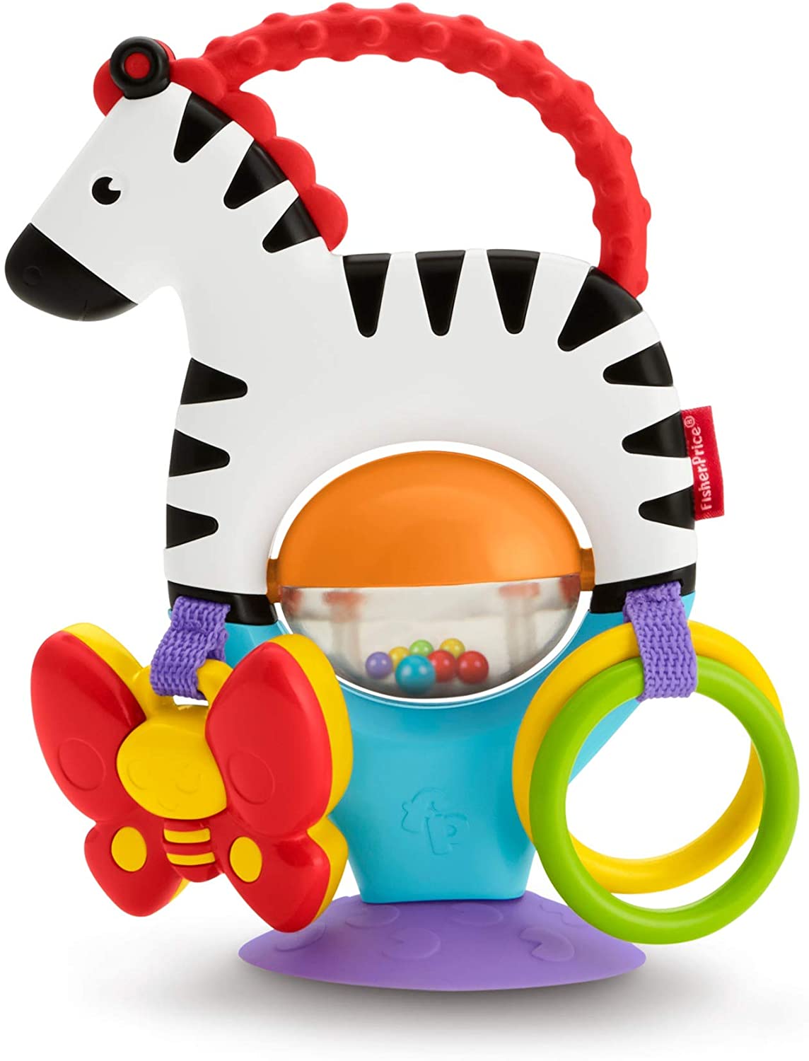 Voici un hochet avec une base ventouse afin de le transporter partout. il peut se fixer sur des surfaces variées tout en offrant diverses activités d'éveil. il est composé de: - une roulette à billes qui tourbillonnent quand le zèbre est en mouvement - un papillon hochet accroché à sa base - 2 anneaux pour développer la motricité fine - une poignée en matériau souple pour accompagner le développement de la dentition