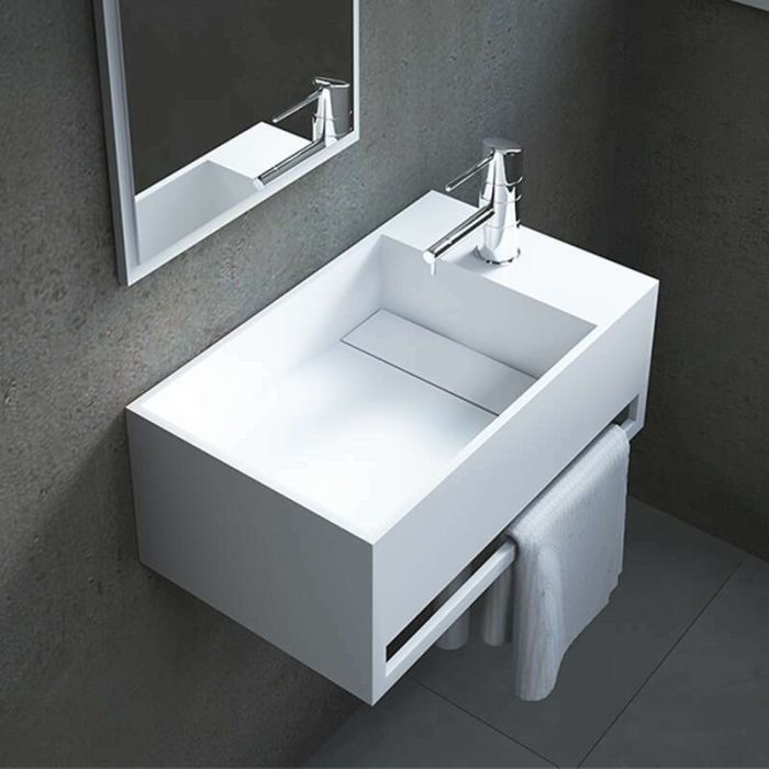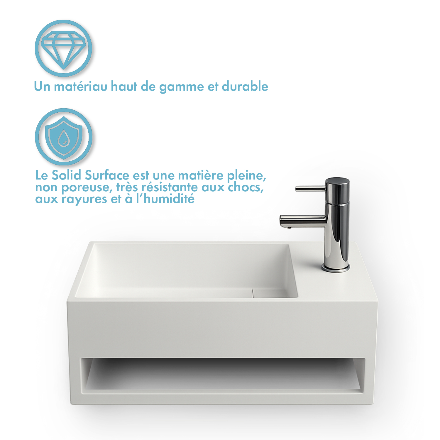 Pratique, le lave-mains suspendu est équipé d’une plage de robinetterie sur le côté droit et d’un porte-serviette. Il vous sera également livré avec des accroches murales pour une fixation solide. Son percement sur le côté vous permet d’y fixer un mitigeur.