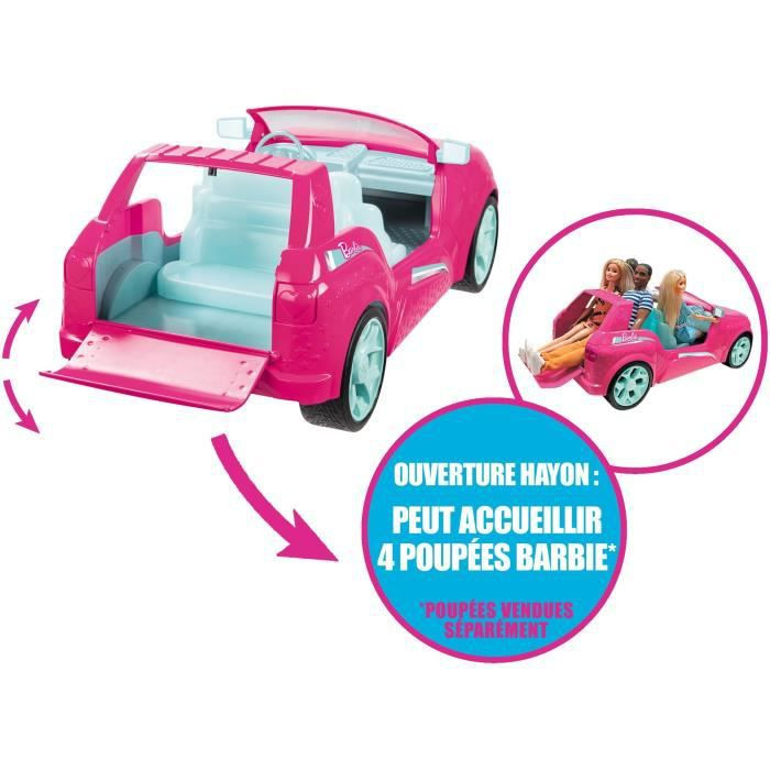 SUV cabriolet télécommandé Barbie Cruiser. Avec son look a la fois moderne et "girly", et pouvant accueillir 4 poupées (non incluses) grâce a l'ouverture du hayon arriere, le SUV cabriolet télécommandé Barbie Cruiser est idéal pour emmener Barbie et ses ami(e)s en balade. Il se pilote facilement grâce a sa télécommande "clef" infra-rouge, qui vient se ranger dans l'emplacement prévu a cet effet (entre les 2 sieges av