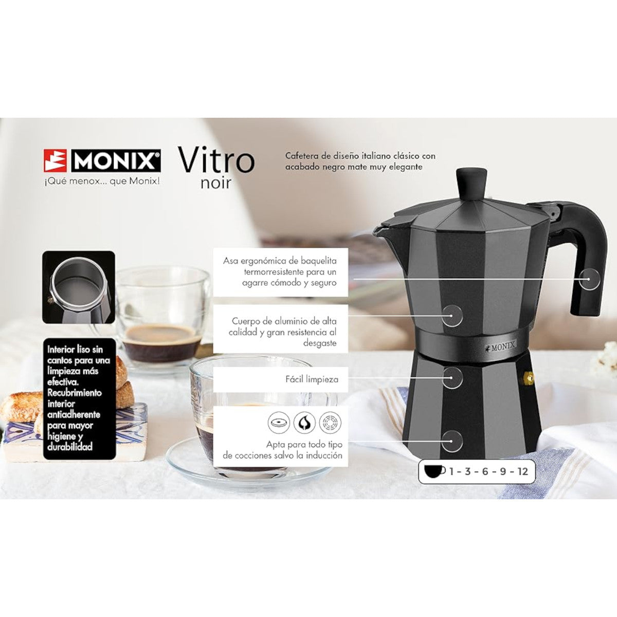 | Libellé | MONIX Vitro Noir | Cafetière de 3 Tasses Noire, Fabriquée en Aluminium, Compatible Toutes Sources de Chaleur Sauf Induction |
