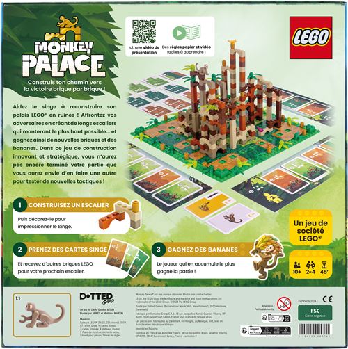 Monkey Palace est un jeu de stratégie familial dès 10 ans sur le thème de la jungle à la fois collaboratif et compétitif, qui allie le talent de créateurs de jeu (David Gordon, Tam) et la licence de jouets les plus populaires au monde, Lego. Empilez brique sur brique pour construire un palais, tout en augmentant vos revenus par rapport aux autres. Nombre de joueurs : 2 à 4 joueurs - Durée de jeu : 30 min env.