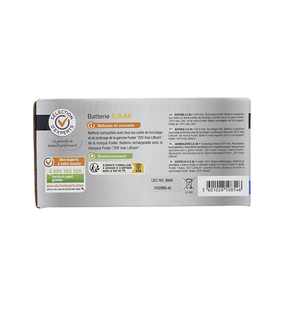 | Libellé | Monobatterie 20V Max - Batterie 2,5 Ah - Sélection d'Experts - Foxter |