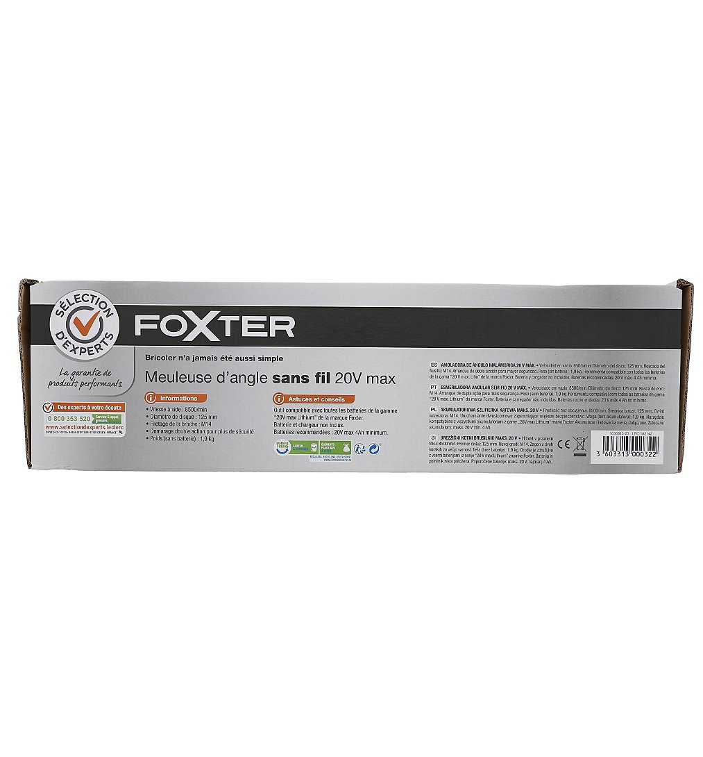 | Libellé | Monobatterie 20V Max - Meuleuse d'angle - Sélection d'Experts - Foxter |