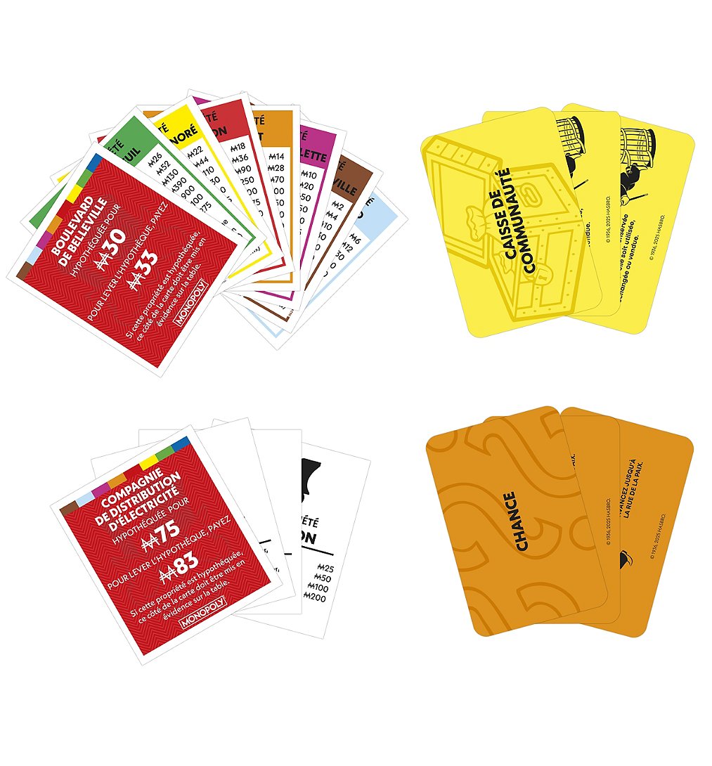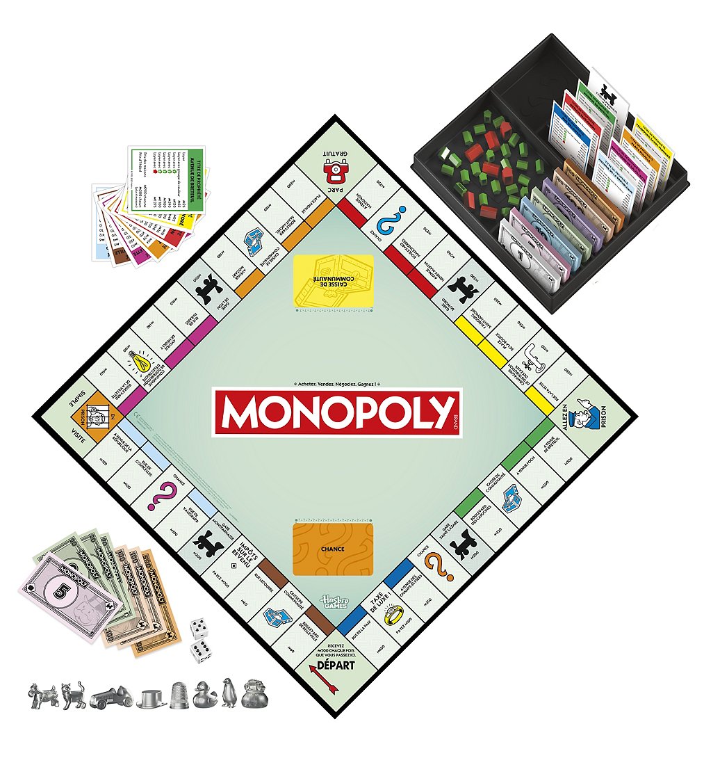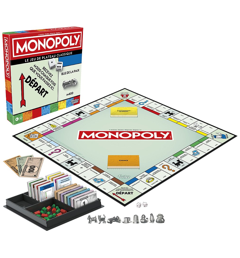 La boîte contient Inclus : plateau de jeu, 8 pions, 28 titres de propriété, 16 cartes Chance, 16 cartes Caisse de communauté, 32 maisons, 12 hôtels, 2 dés, boîte de rangement, liasse de billets Monopoly et règles du jeu.