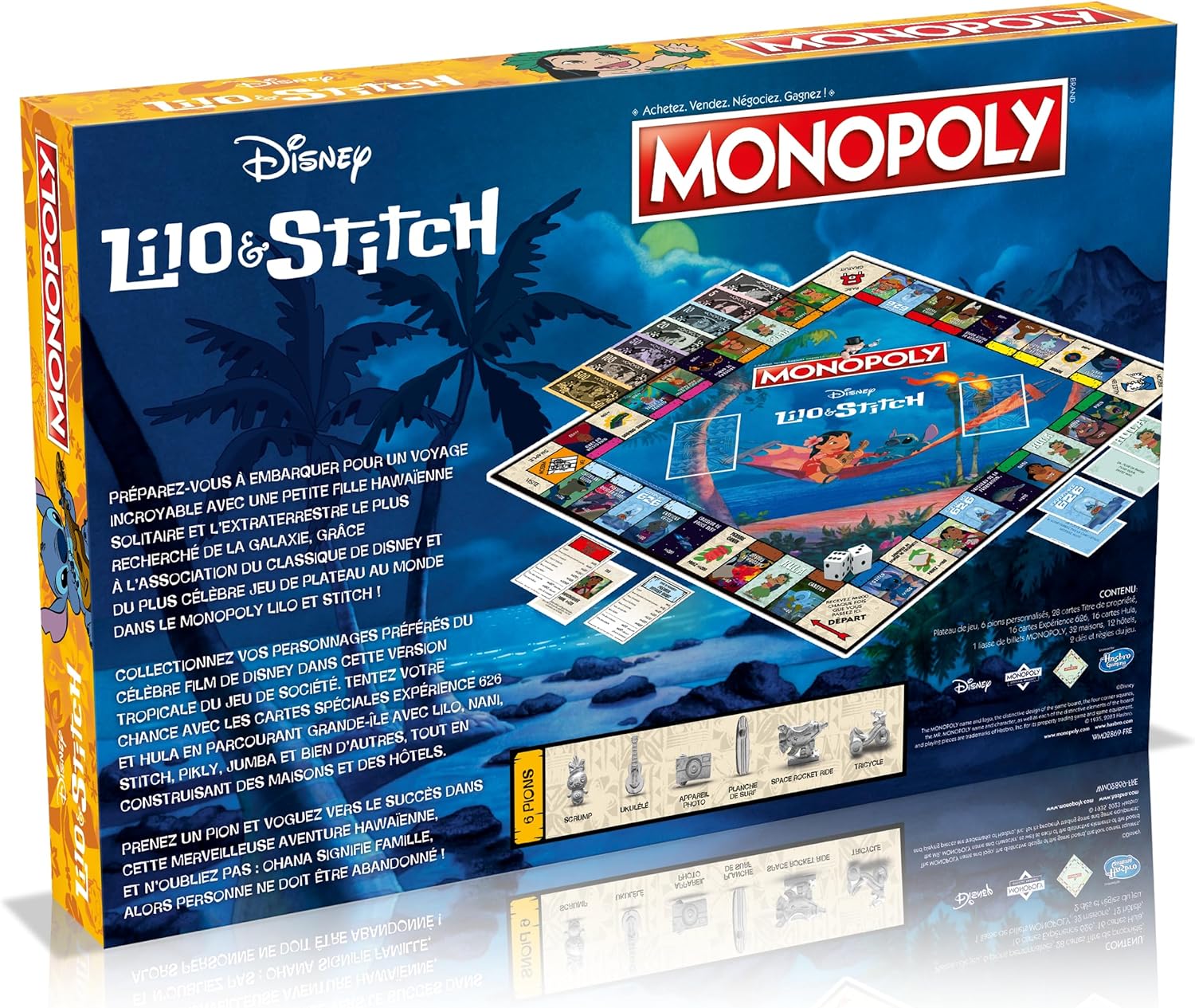 Plongez dans l'univers décalé et coloré de Lilo & Stitch avec ce Monopoly spécial Disney ! Parcourez les lieux emblématiques du film d'animation, comme la maison de Lilo, la plage de Kokaua, le refuge pour animaux ou le vaisseau du Grand Conseil. Achetez, vendez et échangez des propriétés avec vos personnages préférés, comme Nani, David, Jumba ou Pleak. Mais attention aux cartes Expérience et Ohana, qui peuvent changer le cours de la partie ! Utilisez les pions exclusifs à l'effigie de Stitch, Scrump, Elvis Stitch ou Angel pour vous déplacer sur le plateau. Que vous soyez fan de Disney ou de Monopoly, ce jeu de société est fait pour vous ! Il vous fera passer des moments inoubliables en famille ou entre amis, tout en vous faisant découvrir ou redécouvrir le monde merveilleux de Lilo & Stitch. Pour 2 à 6 joueurs, à partir de 8 ans. Durée moyenne d'une partie : 60 minutes.