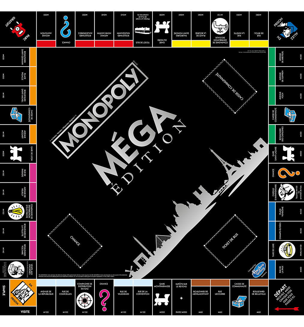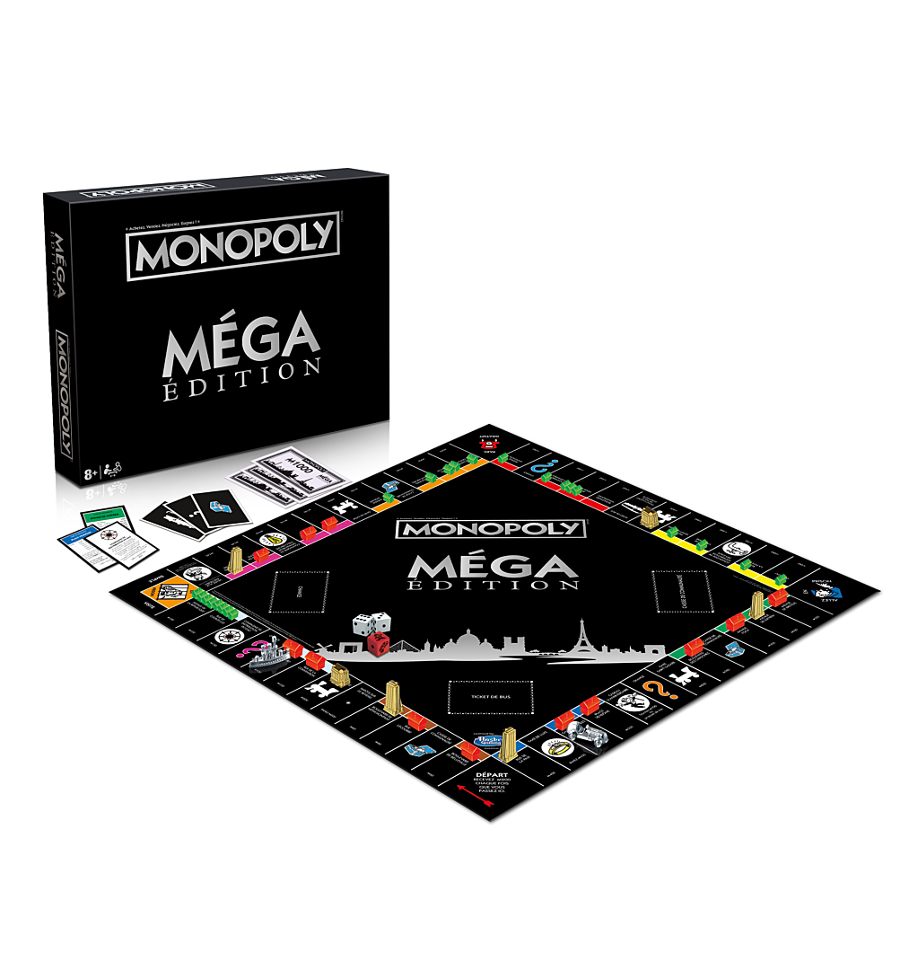 Dans cette version Méga du Monopoly, profitez de 12 nouvelles cases pour construire des gratte-ciels et percevoir des mégas loyers ! Arpentez le plateau à la conquête des emblématiques rue de la capitale et utilisez le bus pour devancez vos adversaires !