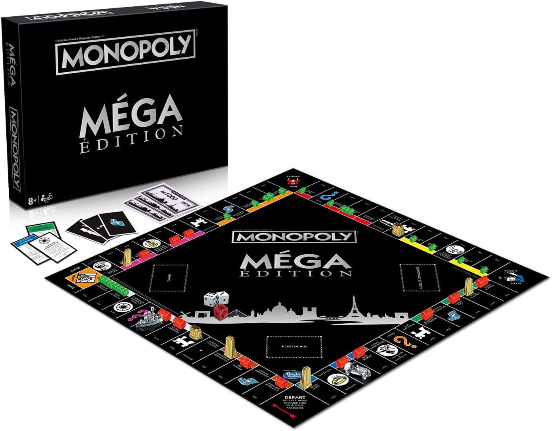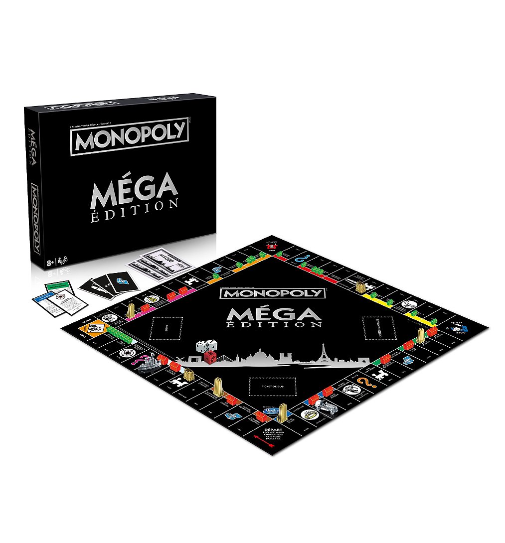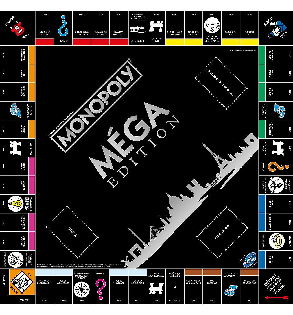 Dans cette version Méga du Monopoly, profitez de 12 nouvelles cases pour construire des gratte-ciels et percevoir des mégas loyers ! Arpentez le plateau à la conquête des emblématiques rue de la capitale et utilisez le bus pour devancez vos adversaires !