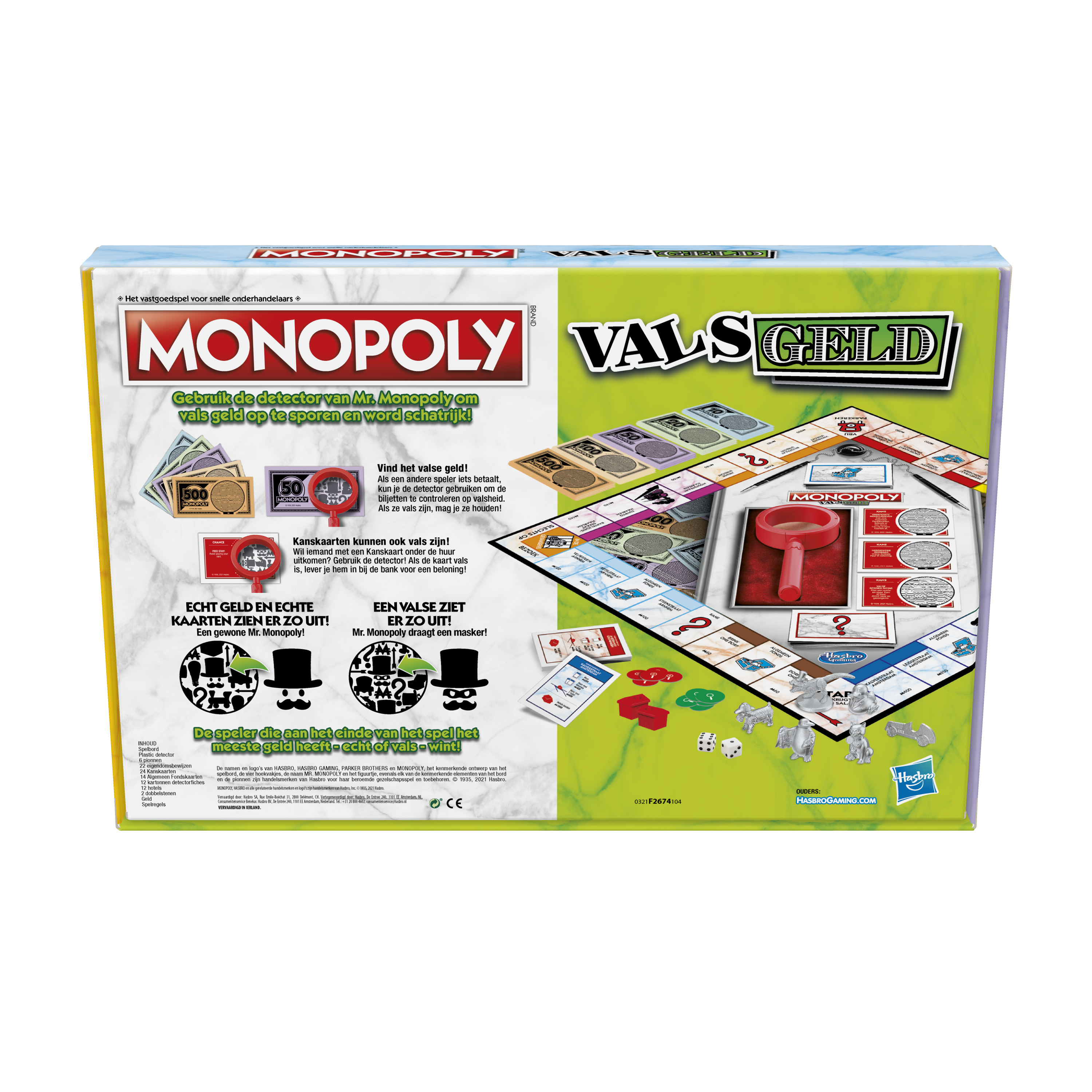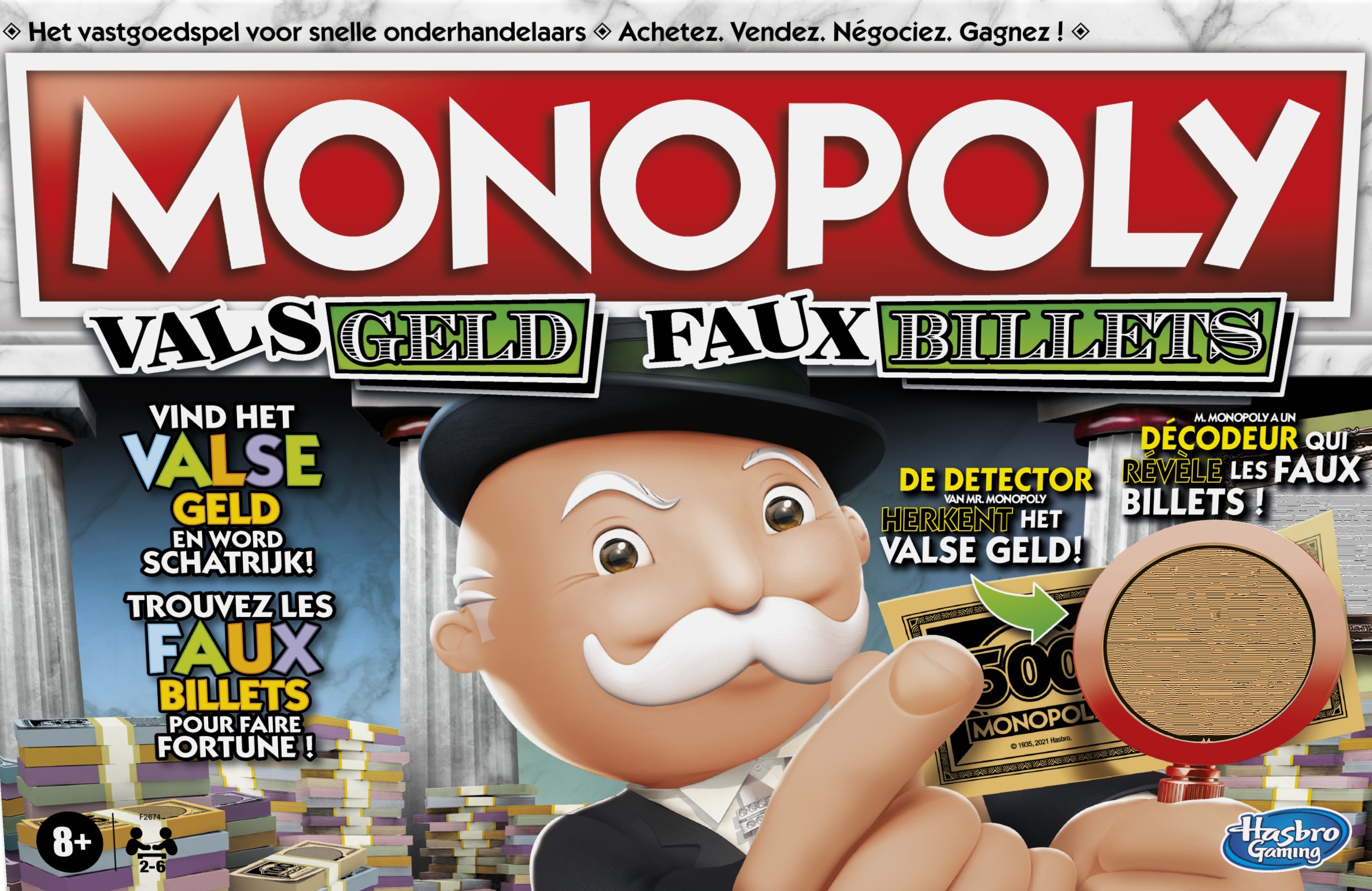 Au Monopoly Faux billets, il ne faut pas se fier aux apparences, car quelqu'un a ajouté de faux billets et de fausses cartes Chance au jeu. Heureusement, M. Monopoly met son décodeur à la disposition des joueurs pour les aider à dénicher les faux billets tout en faisant fortune. Dans ce jeu captivant de révélations, les joueurs utilisent judicieusement leurs jetons pour défier leurs adversaires. Inclut des pions Monopoly qui mettent en valeur la thématique du jeu. Le joueur avec le plus d'argent (vrai ou faux) à la fin de la partie gagne. Ce jeu de société amusant pour la famille est un super choix pour les soirées de jeu ou pour une activité d'intérieur pour les enfants (à partir de 8 ans). Les noms et logos Hasbro, Hasbro Gaming, Parker Brothers et Monopoly, la conception exclusive du plateau de jeu, les quatre cases de coin du plateau, le nom et le personnage M. Monopoly, chacun des éléments distinctifs du plateau de jeu et les accessoires du jeu sont des marques de commerce de Hasbro pour son jeu de transactions de propriétés et les accessoires afférents.