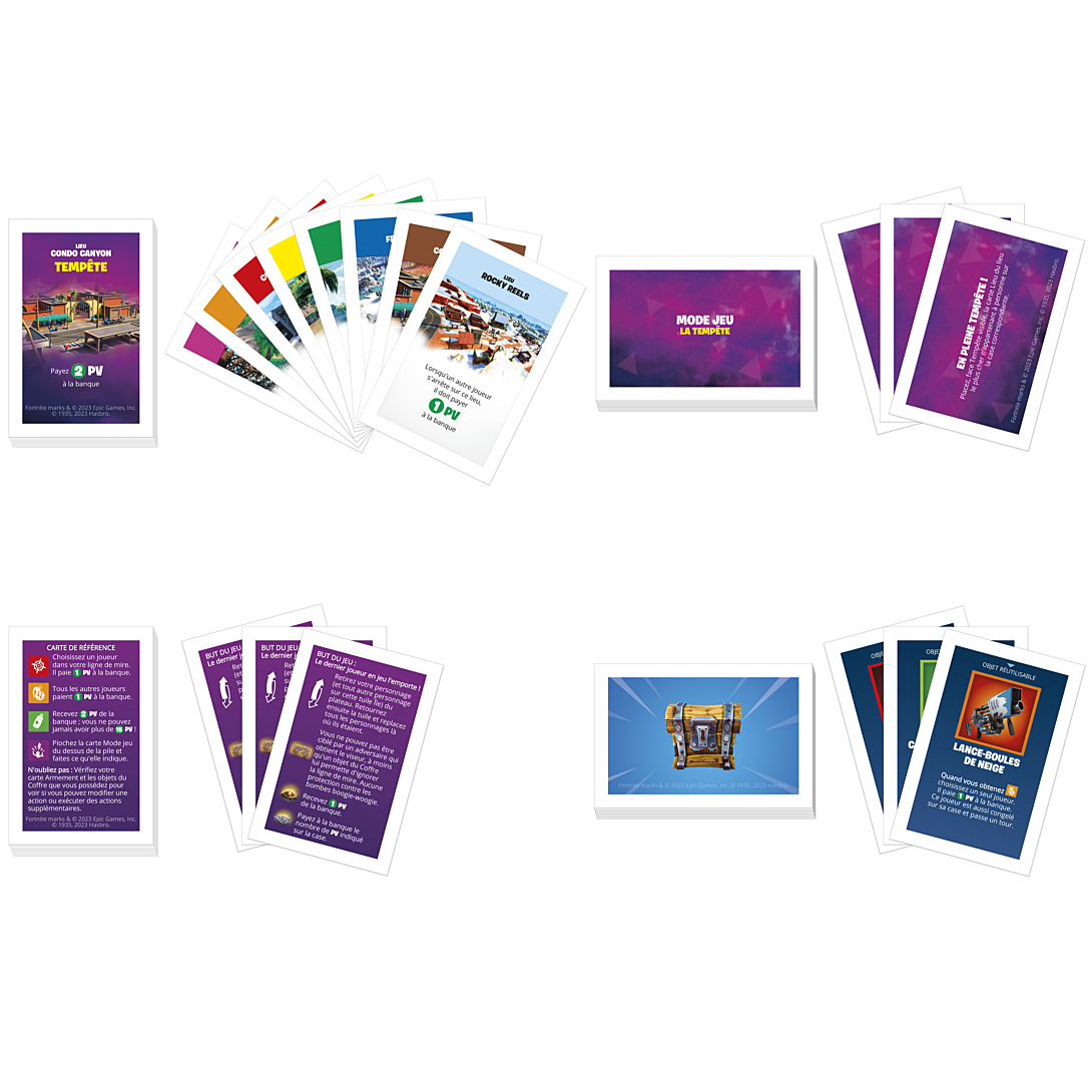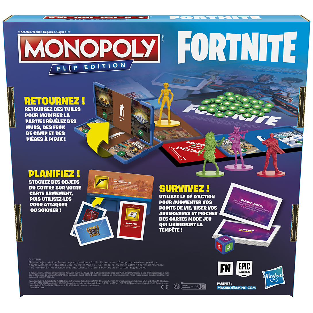 Plus produit JEU MONOPOLY INSPIRÉ DE FORTNITE : Retournez. Déjouez. Survivez. Dans ce Monopoly Flip : édition Fortnite, ce n\'est pas ce que les joueurs possédent qui compte, mais combien de temps ils pourront survivre ! ON RETOURNE DES TUILES POUR MODIFIER LE PLATEAU : Le plateau dynamique inclut 8 tuiles Île que les joueurs retournent pour modifier le plateau et dévoiler entre autres des lieux et des dangers célèbres de Fortnite. Attention aux pièges à pieux ! CRÉER SON ARMEMENT : Chaque joueur choisit une carte Armement qui inclut un objet permanent donnant un avantage au joueur. On peut stocker des objets de son Coffre sur sa carte et les utiliser pour attaquer ou soigner ACTIVER DES ACTIONS SPÉCIALES : Les joueurs lancent le dé d\'action pour augmenter leurs points de vie, cibler leurs adversaires et piocher des cartes Mode jeu qui déchaînent la Tempête LE DERNIER JOUEUR EN JEU : Dans cette bataille royale, les joueurs obtiennent et perdent des jetons Point de vie (PV) à la place des billets Monopoly. Les joueurs qui perdent leur dernier PV sont éliminés ! Le dernier joueur avec encore des PV remporte la partie