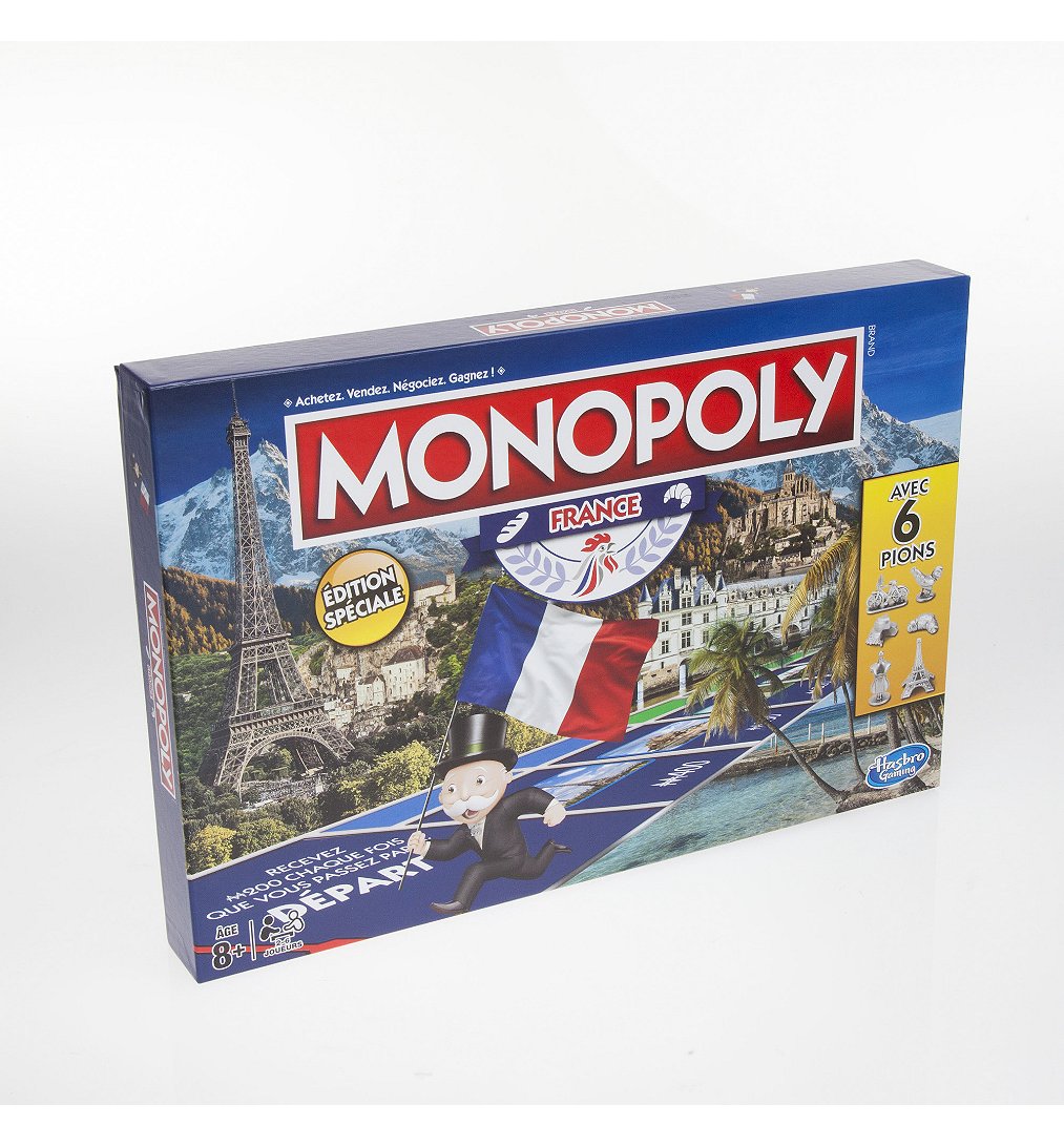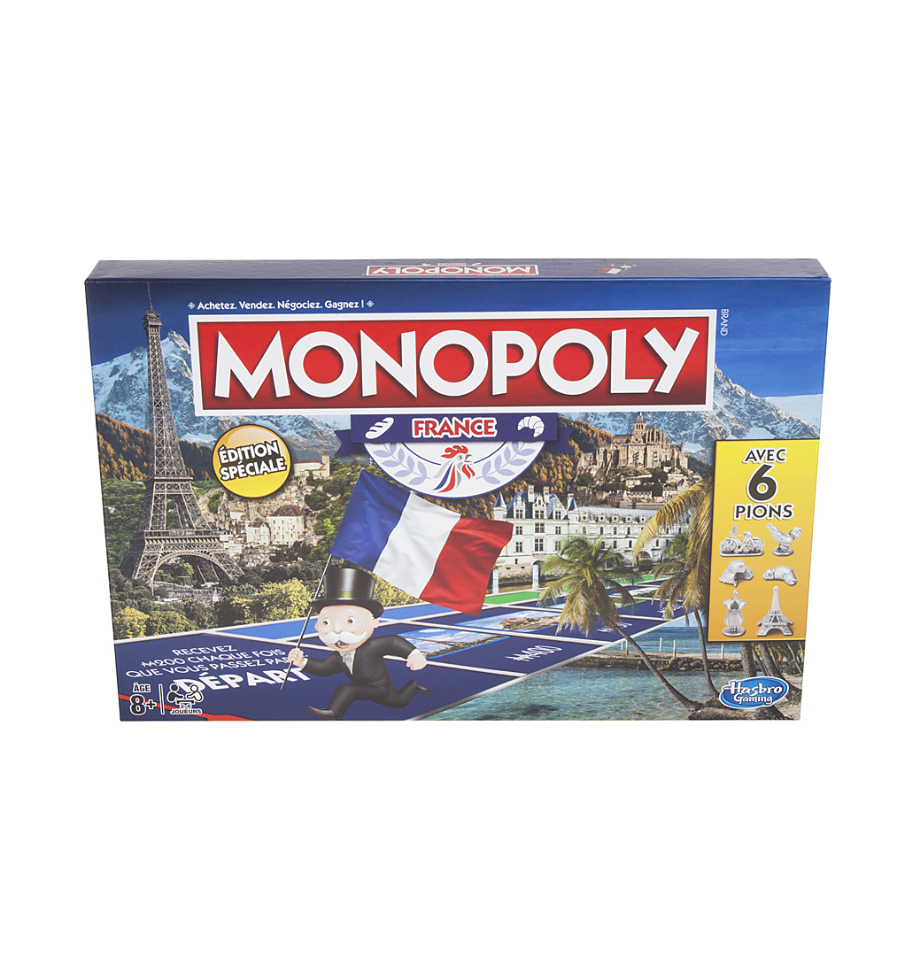 | Plus produit | MONOPOLY CÉLÈBRE LA FRANCE : Les joueurs tentent de tout gagner à ce Monopoly qui inclut des illustrations, des personnages, des propriétés et des thèmes inspirés de la France PIONS MONOPOLY À THÉMATIQUE FRANCE : Les joueurs peuvent choisir parmi 6 pions uniques inspirés de la France, dont un croissant, un vélo et la tour Eiffel INCLUT DES LIEUX DE LA FRANCE : Ce Monopoly inclut certaines destinations populaires de France. Les joueurs achètent, vendent et échangent des lieux emblématiques de la France CARTES PERSONNALISÉES : Le Monopoly : édition France inclut des cartes personnalisées Chance et Caisse de communauté qui peuvent faire varier la fortune d\'un joueur en un instant JEU AMUSANT POUR 2 À 6 JOUEURS : Le Monopoly est un choix parfait pour une soirée de jeu en famille. Le jeu est un super cadeau (à partir de 8 ans) |