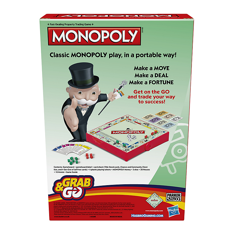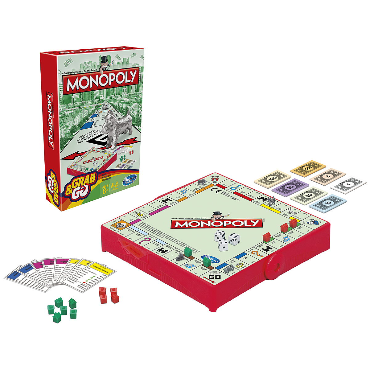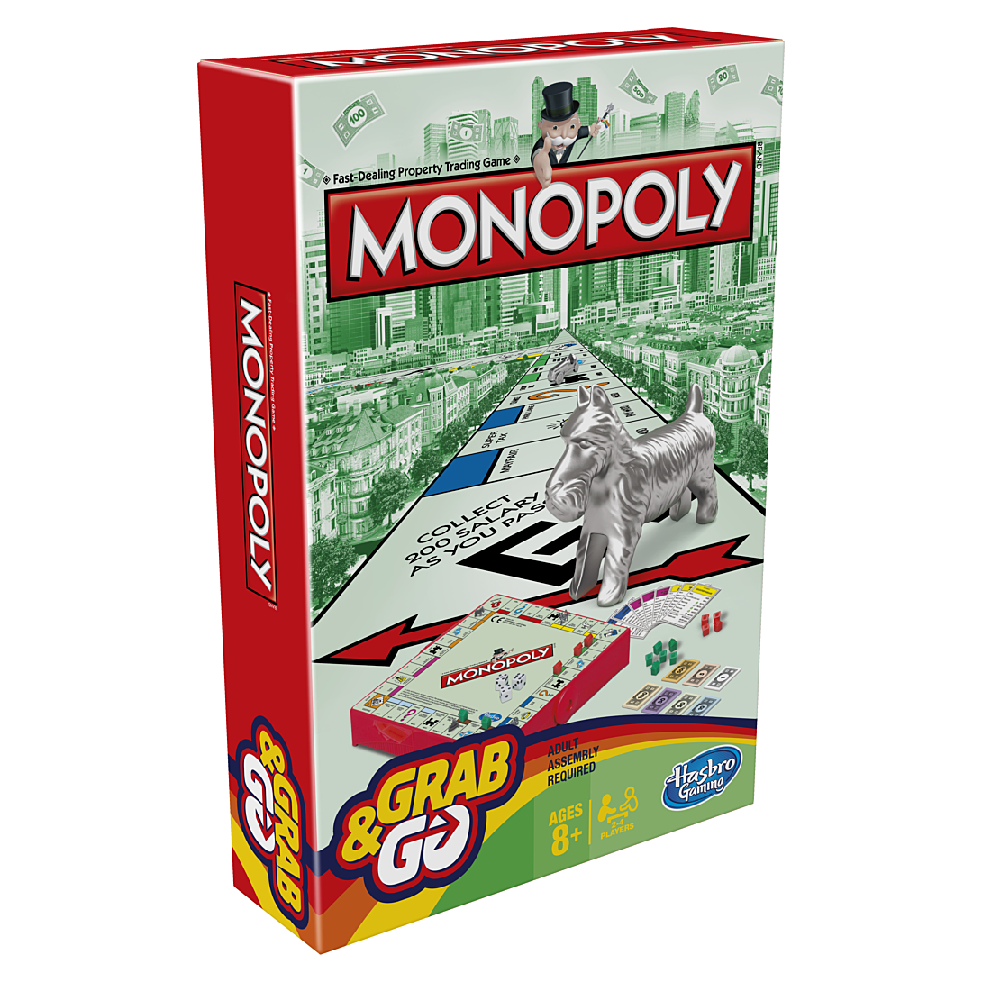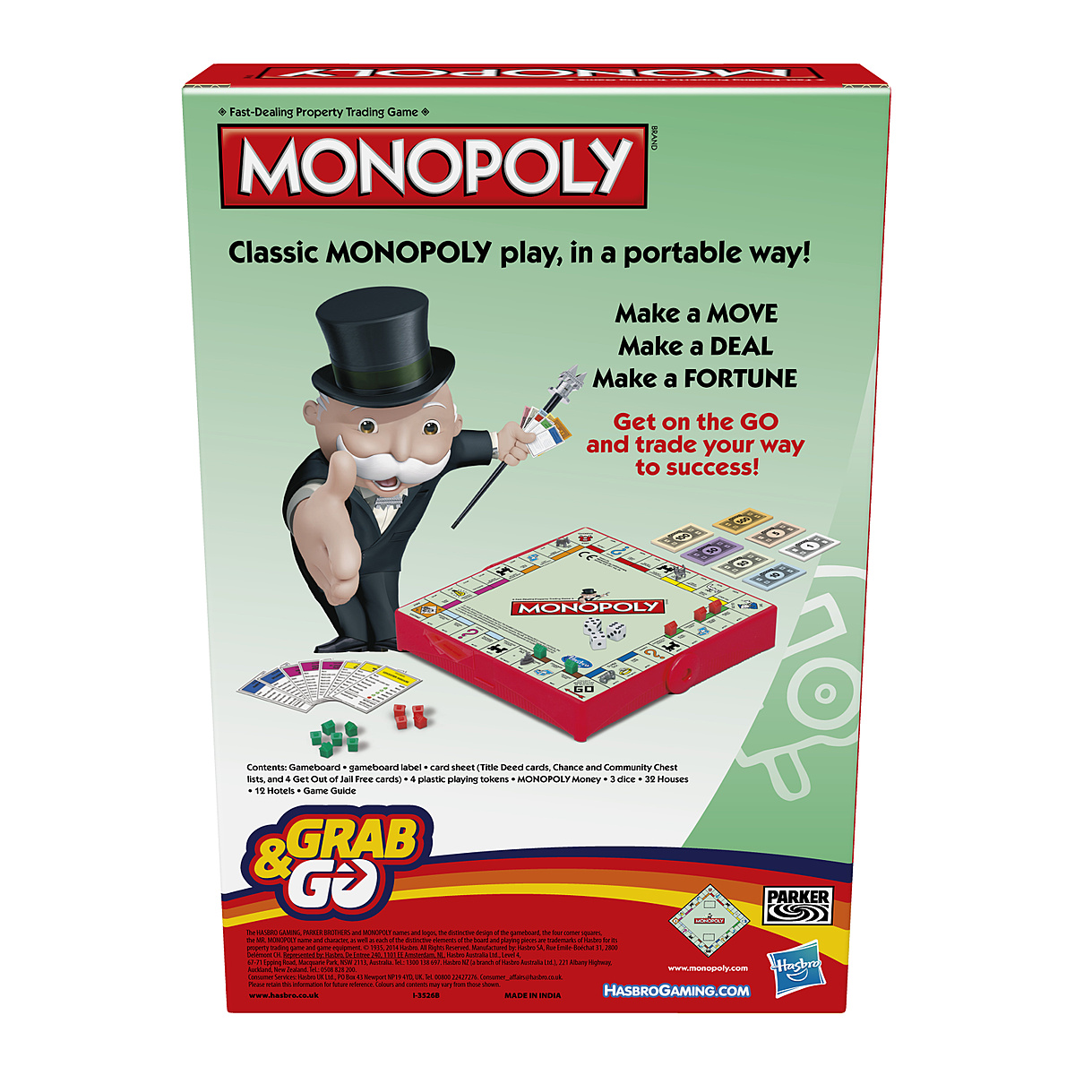 Plus produit Le jeu Grab & Go est une version compacte et facilement transportable du Monopoly Inclut toutes les propriétés classiques et les cartes Chance et Caisse de communauté Les pièces se rangent dans la plateau de jeu Accessoires inclus : Plateau de jeu, autocollant de plateau de jeu, cartes de jeu (Propriété, Chance, Communauté et 4 cartes Vous êtes libéré de prison), 4 pions en plastique, billets de banque Monopoly, 3 dés, 32 maisons, 12 hôtels et les règles du jeu en français. Aucune pile n\'est nécéssaire. Vous aimez les jeux de société et partager un moment en famille ou entre amis ? Monopoly Edition voyage est le jeu parfait à offrir en cadeau pour les enfants, filles et garçons de 8 ans, 9 ans, 10 ans et plus.