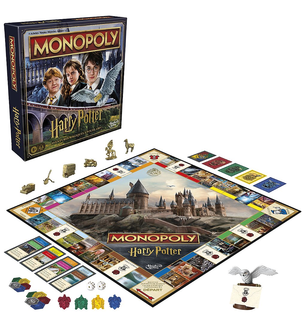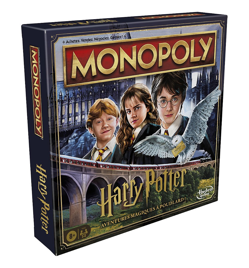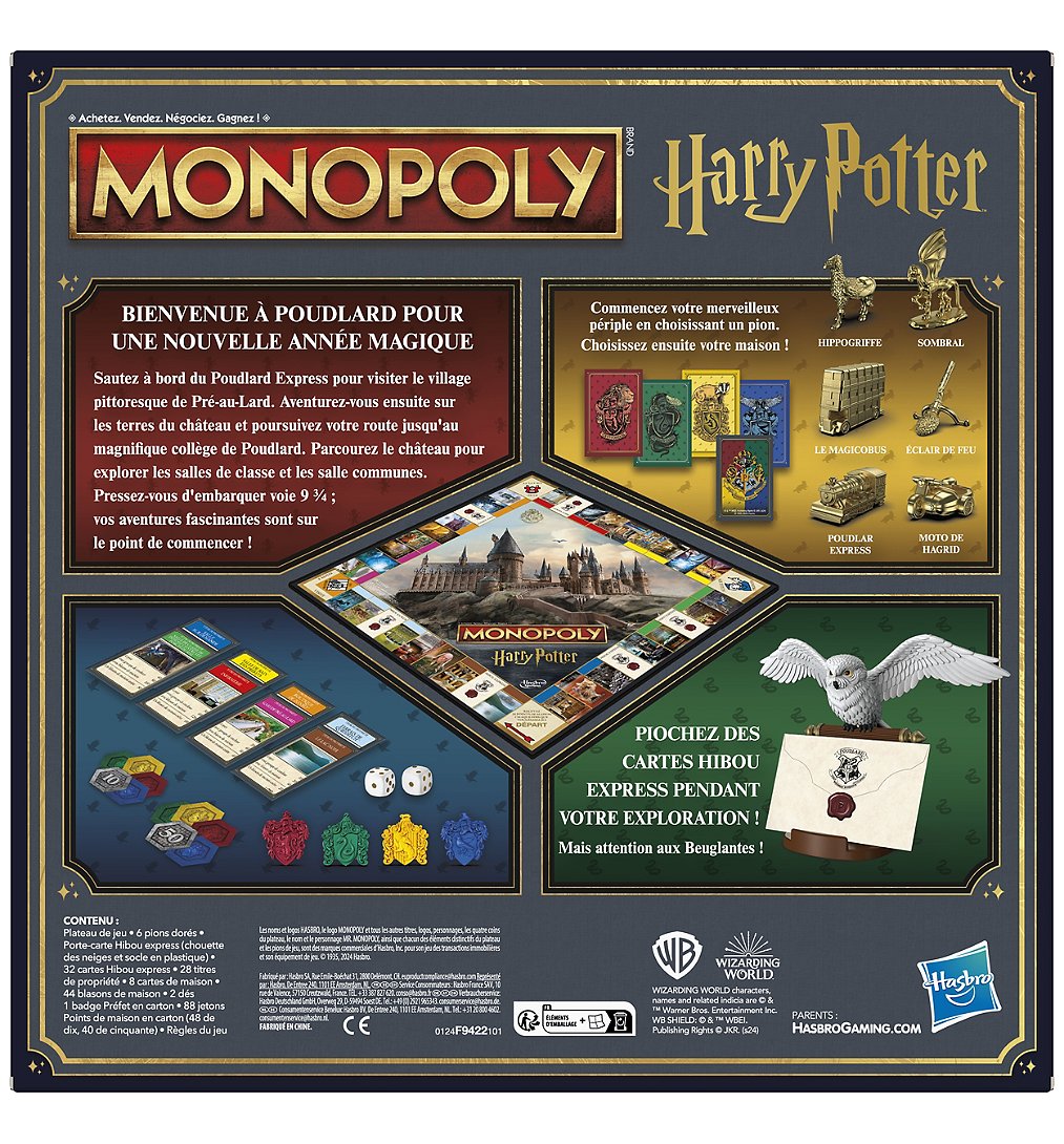 - INSPIRÉ DE HARRY POTTER : Bienvenue à Poudlard ! Les joueurs incarnent un élève dans le jeu de plateau Monopoly Harry Potter qui combine le jeu Monopoly classique aux illustrations, aux lieux et à la thématique du monde des sorciers - PIONS DORÉS EMBLÉMATIQUES : Les joueurs parcourent le plateau avec un des six pions dorés sur le thème des transports enchantés : hippogriffe, Magicobus, Poudlard Express, moto de Hagrid, Sombral et Éclair de feu - CHOISIR UNE MAISON : Gryffondor, Poufsouffle, Serdaigle ou Serpentard ? Chaque joueur choisit une carte de maison pour laquelle il recevra des points pendant la partie - PLATEAU DE JEU SUR LE THÈME DE POUDLARD : Les joueurs explorent les salles de classe, les salles communes et les autres lieux préférés de Poudlard et les environs ! Plus un joueur explore de lieux, plus il recevra de points de maison des autres joueurs - CARTES ET PORTE-CARTE HIBOU EXPRESS : Les cartes Hibou express remplacent les cartes Chance et Caisse de communauté. Les joueurs piochent une carte sous la figurine de chouette des neiges. Mais attention aux Beuglantes, elles pourraient nuire à votre jeu - UN CADEAU POUR LES FANS DE HARRY POTTER : Un bel emballage et un grand soucis du détail créent une expérience de déballage envoûtante. Le jeu de plateau pour enfants est un cadeau merveilleux pour les fêtes ou l'anniversaire des fans de Harry Potter (à partir de 8 ans) - SOIRÉE DE JEUX EN FAMILLE : À la recherche de jeux de plateau amusants pour la famille, les enfants et les adultes ? Cette édition du jeu Monopoly est un super jeu d'intérieur pour une soirée de jeux en famille et pour les réunions entre amis. Pour 2 à 6 joueurs