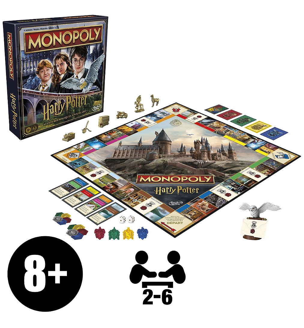 - INSPIRÉ DE HARRY POTTER : Bienvenue à Poudlard ! Les joueurs incarnent un élève dans le jeu de plateau Monopoly Harry Potter qui combine le jeu Monopoly classique aux illustrations, aux lieux et à la thématique du monde des sorciers - PIONS DORÉS EMBLÉMATIQUES : Les joueurs parcourent le plateau avec un des six pions dorés sur le thème des transports enchantés : hippogriffe, Magicobus, Poudlard Express, moto de Hagrid, Sombral et Éclair de feu - CHOISIR UNE MAISON : Gryffondor, Poufsouffle, Serdaigle ou Serpentard ? Chaque joueur choisit une carte de maison pour laquelle il recevra des points pendant la partie - PLATEAU DE JEU SUR LE THÈME DE POUDLARD : Les joueurs explorent les salles de classe, les salles communes et les autres lieux préférés de Poudlard et les environs ! Plus un joueur explore de lieux, plus il recevra de points de maison des autres joueurs - CARTES ET PORTE-CARTE HIBOU EXPRESS : Les cartes Hibou express remplacent les cartes Chance et Caisse de communauté. Les joueurs piochent une carte sous la figurine de chouette des neiges. Mais attention aux Beuglantes, elles pourraient nuire à votre jeu - UN CADEAU POUR LES FANS DE HARRY POTTER : Un bel emballage et un grand soucis du détail créent une expérience de déballage envoûtante. Le jeu de plateau pour enfants est un cadeau merveilleux pour les fêtes ou l'anniversaire des fans de Harry Potter (à partir de 8 ans) - SOIRÉE DE JEUX EN FAMILLE : À la recherche de jeux de plateau amusants pour la famille, les enfants et les adultes ? Cette édition du jeu Monopoly est un super jeu d'intérieur pour une soirée de jeux en famille et pour les réunions entre amis. Pour 2 à 6 joueurs