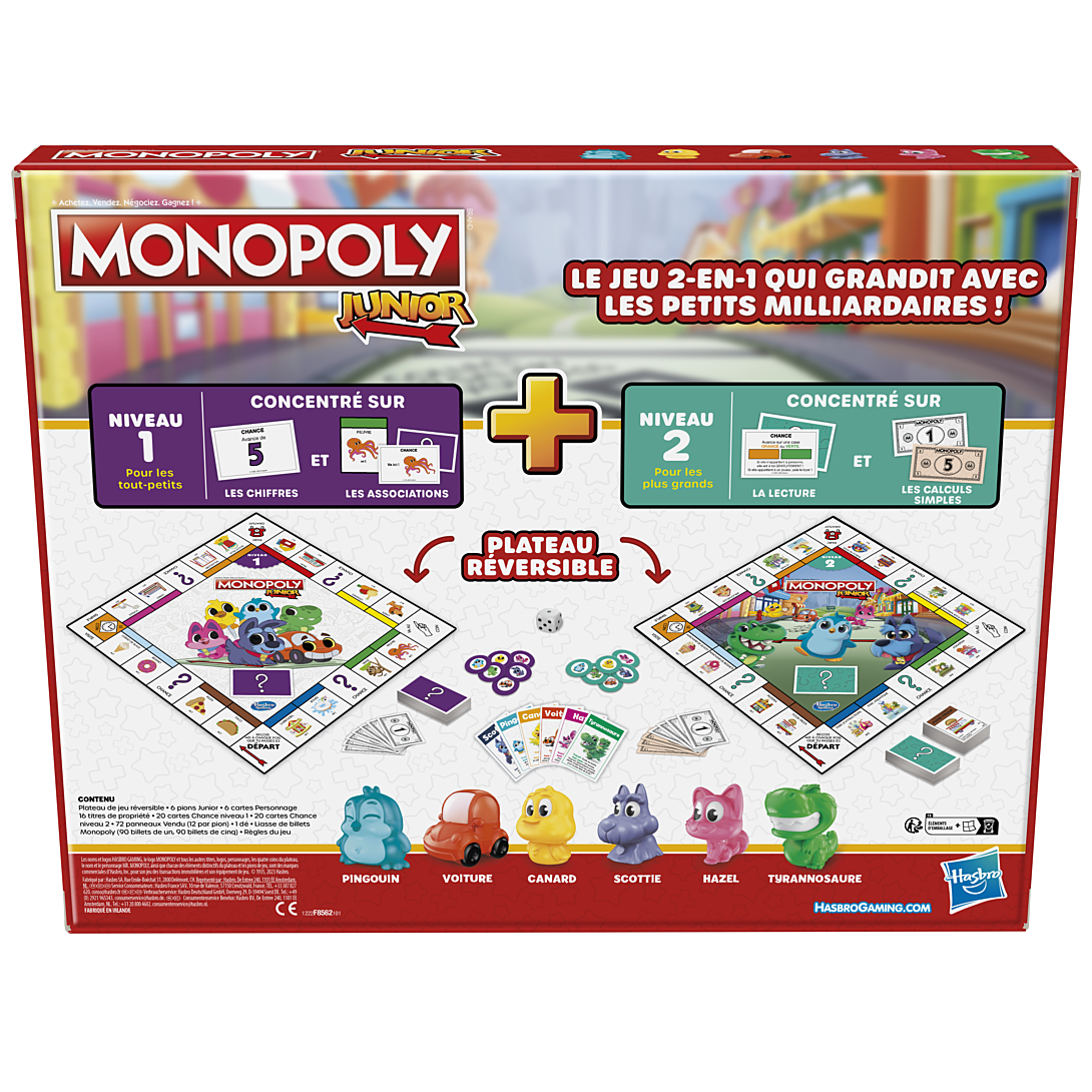 Avec son jeu 2 en 1, ce jeu Monopoly Junior est le jeu des petits milliardaires qui grandit avec les enfants Le plateau réversible permet aux joueurs de décider quel niveau de jeu convient le mieux à leur famille. Le niveau 1, recommandé pour les joueurs âgés de 4 à 5 ans, permet aux enfants de s'exercer à associer et à compter, alors qu'ils comptent les cases du plateau, associent des images et achètent des propriétés. Le joueur qui a le plus de propriétés gagne ! Prêt à passer au niveau supérieur ? Il suffit de retourner le plateau pour découvrir le niveau 2, recommandé pour les joueurs à partir de 6 ans, qui se concentre sur la lecture et les calculs simples. Les joueurs peuvent s'arrêter sur des lieux conçus pour les enfants, tout en achetant des propriétés, en faisant payer des loyers et en découvrant leur fortune. Le joueur le plus riche gagne. Chaque niveau inclut sa propre liasse de billets Monopoly, ses cartes et ses règles. Les deux niveaux incluent 6 pions adorables : le Pingouin, la Voiture, le Canard, Scottie, Hazel et Petit Dino. Ce jeu préscolaire amusant est idéal pour les réunions d'enfants ou les soirées de jeux en famille, en plus de créer des souvenirs mémorables. Les noms et logos HASBRO GAMING, le logo MONOPOLY et tous les autres titres, logos, personnages, les quatre coins du plateau, le nom et le personnage MR. MONOPOLY, ainsi que chacun des éléments distinctifs du plateau et les pions de jeu, sont des marques commerciales d’Hasbro, Inc. pour son jeu des transactions immobilières et son équipement de jeu.