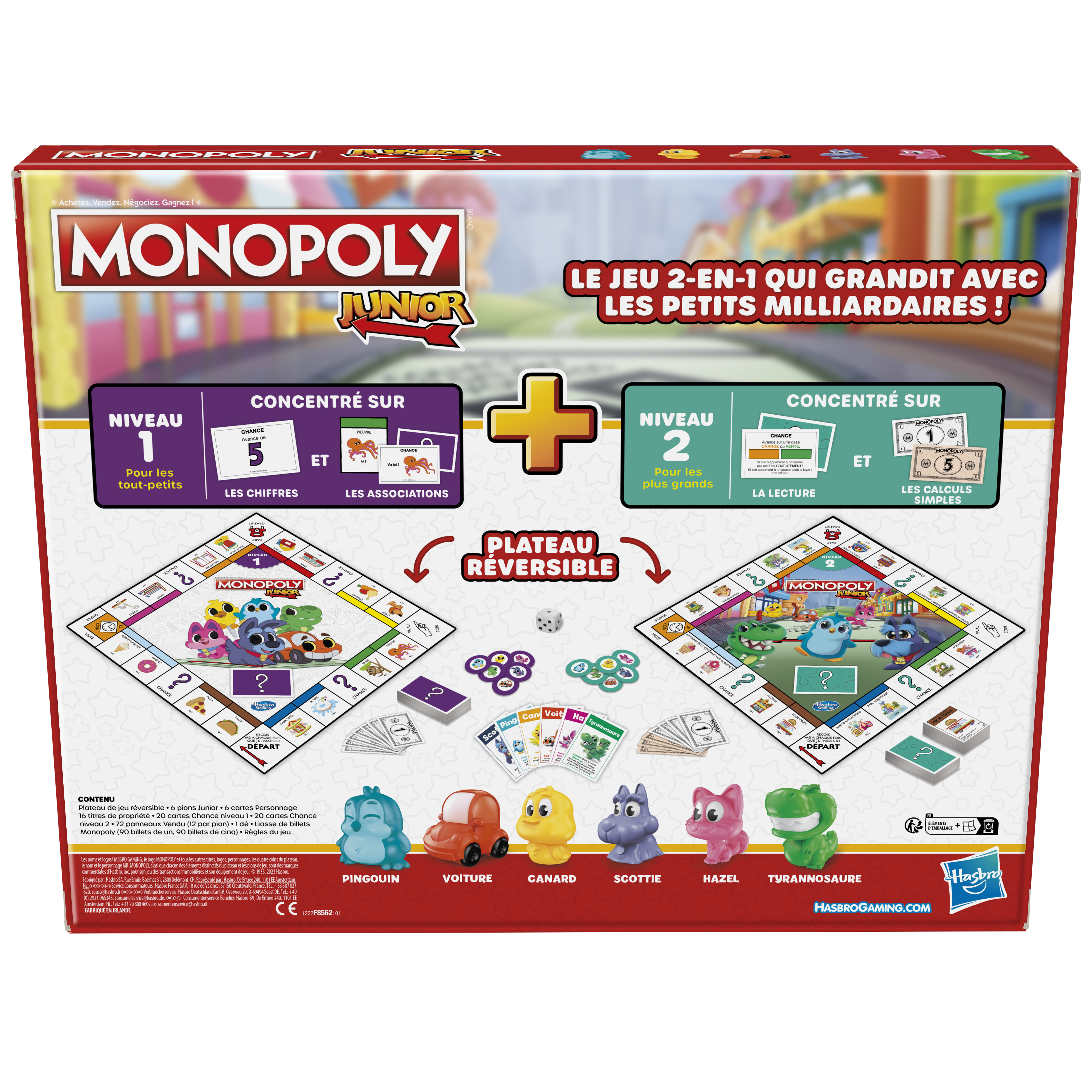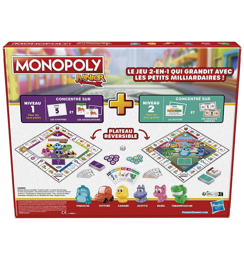 Avec son jeu 2 en 1, ce jeu Monopoly Junior est le jeu des petits milliardaires qui grandit avec les enfants Le plateau réversible permet aux joueurs de décider quel niveau de jeu convient le mieux à leur famille. Le niveau 1, recommandé pour les joueurs âgés de 4 à 5 ans, permet aux enfants de s'exercer à associer et à compter, alors qu'ils comptent les cases du plateau, associent des images et achètent des propriétés. Le joueur qui a le plus de propriétés gagne ! Prêt à passer au niveau supérieur ? Il suffit de retourner le plateau pour découvrir le niveau 2, recommandé pour les joueurs à partir de 6 ans, qui se concentre sur la lecture et les calculs simples. Les joueurs peuvent s'arrêter sur des lieux conçus pour les enfants, tout en achetant des propriétés, en faisant payer des loyers et en découvrant leur fortune. Le joueur le plus riche gagne. Chaque niveau inclut sa propre liasse de billets Monopoly, ses cartes et ses règles. Les deux niveaux incluent 6 pions adorables : le Pingouin, la Voiture, le Canard, Scottie, Hazel et Petit Dino. Ce jeu préscolaire amusant est idéal pour les réunions d'enfants ou les soirées de jeux en famille, en plus de créer des souvenirs mémorables. Les noms et logos HASBRO GAMING, le logo MONOPOLY et tous les autres titres, logos, personnages, les quatre coins du plateau, le nom et le personnage MR. MONOPOLY, ainsi que chacun des éléments distinctifs du plateau et les pions de jeu, sont des marques commerciales d’Hasbro, Inc. pour son jeu des transactions immobilières et son équipement de jeu.