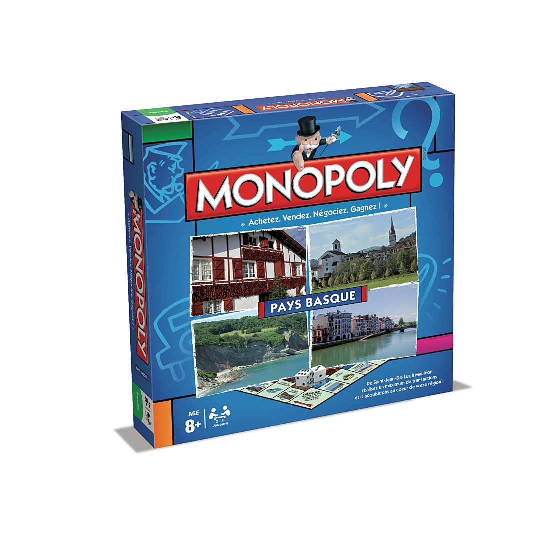 Avec cette édition exclusive, vivez l'expérience Monopoly à travers la magnifique région qu'est Le Pays Basque ! Achetez, vendez et négociez les lieux les plus emblématiques de la région et devenez le plus riche Basquais !