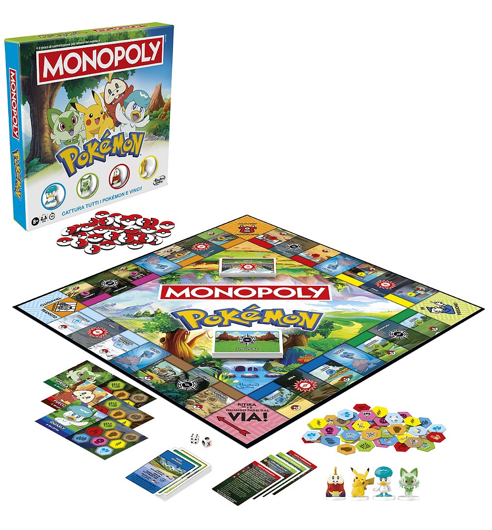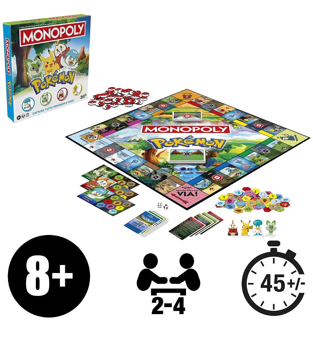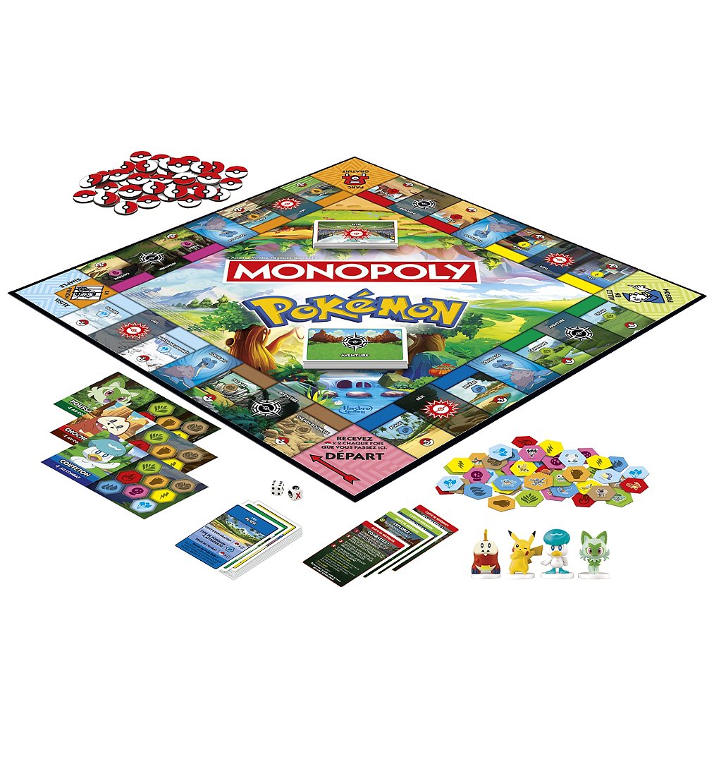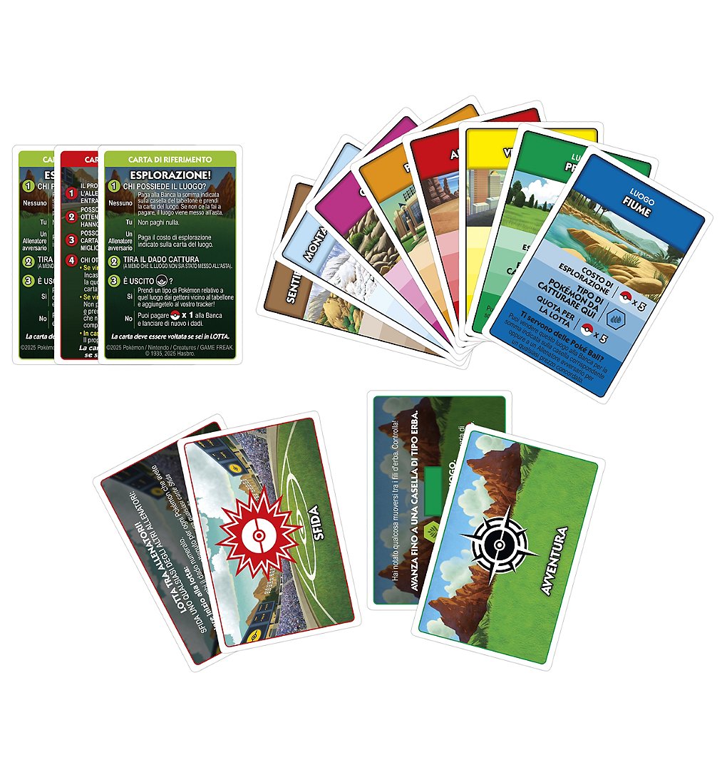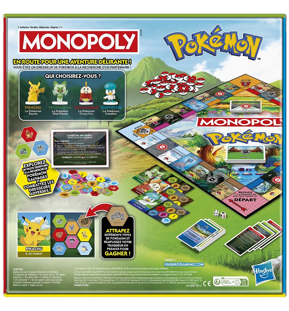 | La boîte contient | Inclus : plateau de jeu, 4 pions Pokémon en plastique, 4 traqueurs de Pokémon, 16 cartes Lieu, 16 cartes Aventure, 16 cartes Défi, 4 cartes de référence, 1 dé numéroté, 1 dé de capture avec autocollants, 48 jetons Pokémon sauvage en carton, 90 Poké Balls en carton et règles du jeu. |