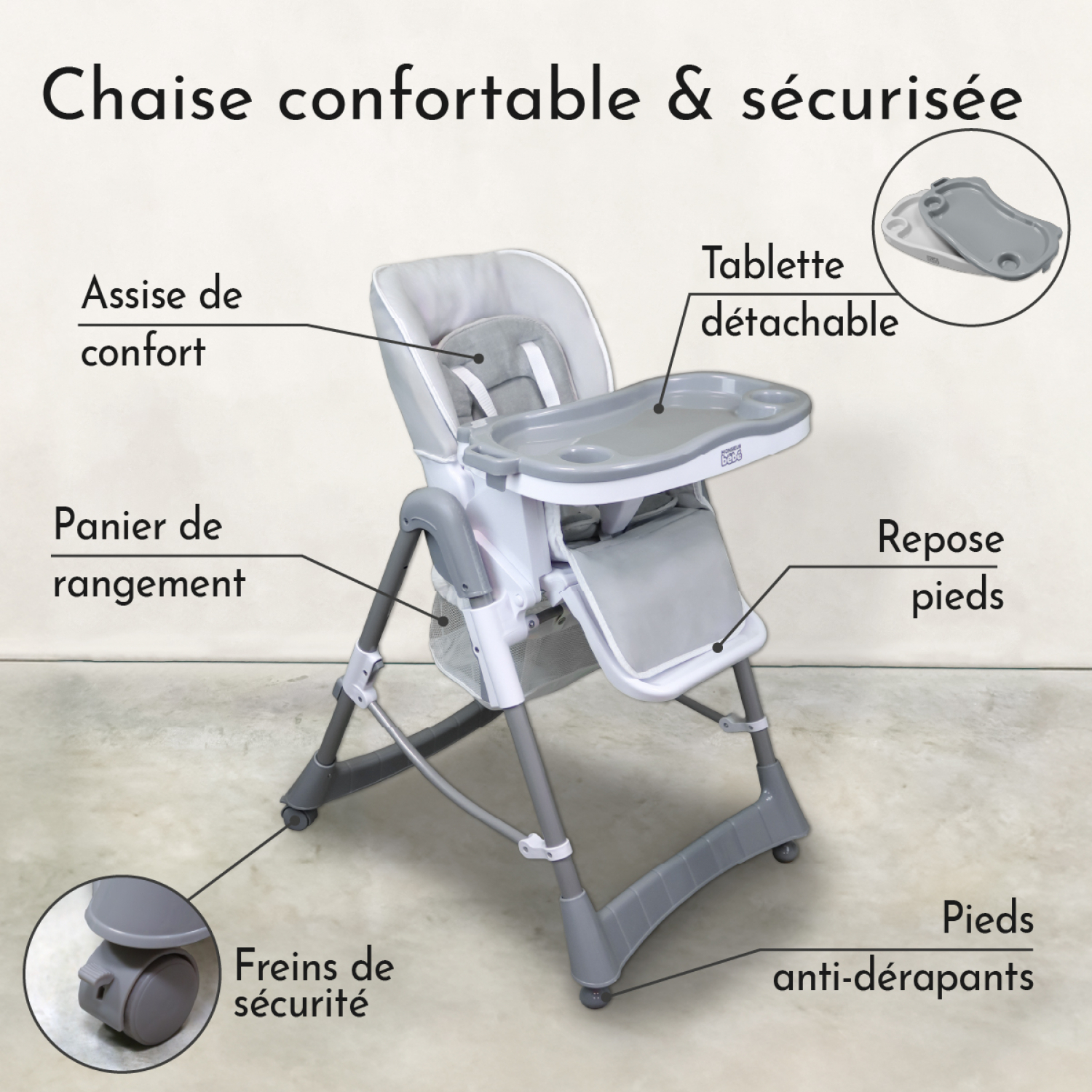 La chaise haute Ptit de Monsieur Bébé est un indispensable et permet à bébé de partager le repas avec toute la famille. Elle est idéale pour accompagner votre enfant dans l'apprentissage de son alimentation. Destinée à tous les parents qui souhaitent un produit pratique, confortable, robuste et fonctionnel, au design unique, la chaise possède une structure sûre en acier stable. Une housse anti-transpirante et lavable en machine est fournie ainsi qu'un petit coussin de confort supplémentaire pour le bien-être de votre enfant. La Chaise Haute est conforme aux exigences de sécurité et est destinée à des enfants capables de se tenir seuls en position assise, âgés au maximum de trois ans ou de poids inférieur ou égal à 15 kg. Cette chaise haute dispose de 3 positions réglables en hauteur (de 45 à 65 cm), 3 positions d'inclinaison du dossier et de 3 positions d'ajustement de la tablette (avec ses emplacements pratiques). La tablette est détachable et lavable. Ses accoudoirs sont relevables. Un panier détachable et suspendu sous la chaise vous permet de ranger quelques affaires de votre enfant. Le panier est toujours accessible même lorsque la chaise est pliée. Cette chaise dispose de 2 roues avec système de blocage, de 2 pieds antidérapants et d'un repose pieds. La chaise haute mesure 75 cm de profondeur, 60 cm de largeur et 100 cm de hauteur. La profondeur du siège est de 25 cm. La chaise est pliante (35 cm d'épaisseur une fois pliée) afin d'optimiser la place à la fin du repas de l'enfant. Le harnais de sécurité dispose de 5 points. Notre ambition est de répondre à vos besoins du quotidien en vous proposant des gammes de plus en plus variées et tendance. Un large éventail de produits est à retrouver à travers nos différentes marques.