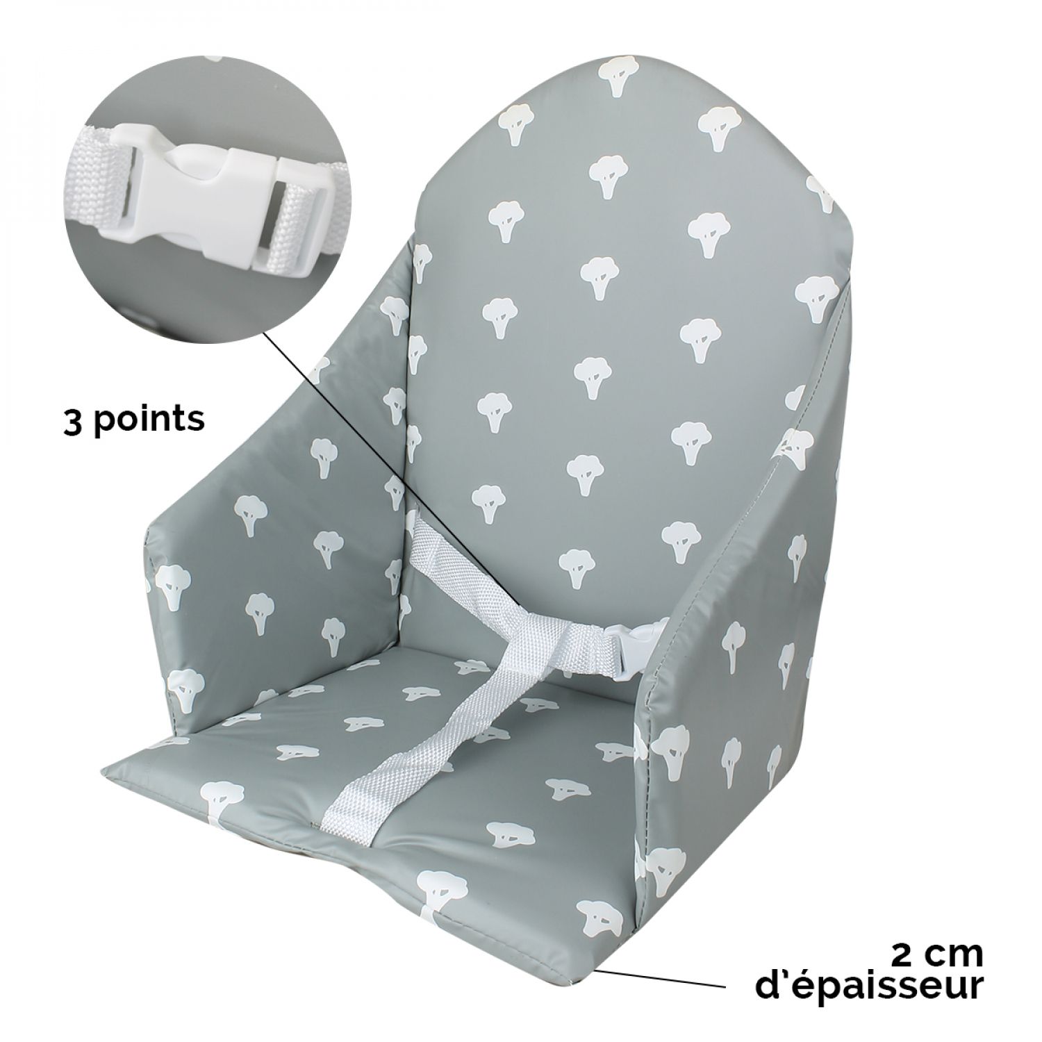 Monsieur Bébé - Coussin d'assise universel Miam avec harnais pour chaise haute bébé - Gris foncé brocolis