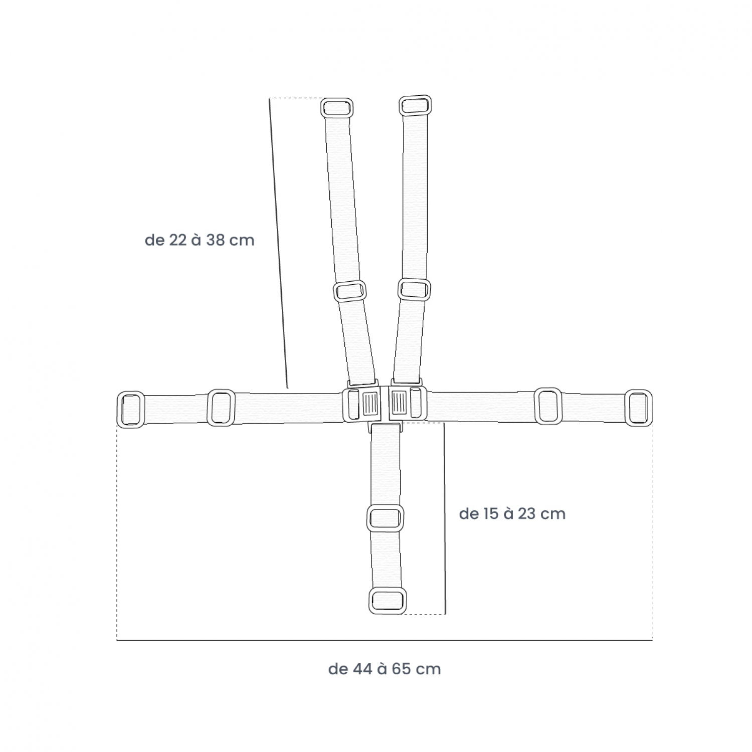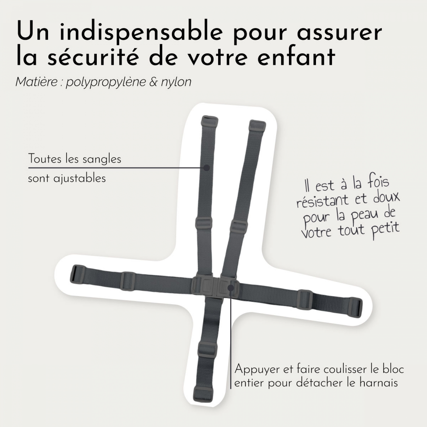 Ce harnais cinq points, de la marque Monsieur Bébé, est un élément indispensable pour assurer la sécurité de votre enfant lorsqu’il est assis sur les chaises hautes Délice de Monsieur Bébé lors de la prise des repas. Robuste, il est réalisé en polypropylène et en nylon, il est à la fois résistant et doux pour la peau de votre tout petit. Également ajustable en taille, ce harnais suivra la croissance de votre enfant à différents stades d’âges. Facile à installer et à retirer, il suffit d’appuyer et de faire coulisser le bloc central au milieu afin que le harnais se détache rapidement. Ce harnais convient pour les chaises hautes de la gamme Délice de Monsieur Bébé. Réglable de 44 cm à 65 cm au niveau de la taille, de 22 cm à 38 cm au niveau des épaules, et de 15 à 23 cm pour le bassin. Le bloc central mesure 8 cm de longueur par 3.5 cm de largeur. Convient dès que l’enfant peut se tenir assis, à partir de 6 mois. Le harnais est à changer dès lors qu'il est trop usé ou defectueux. Plusieurs coloris disponibles.