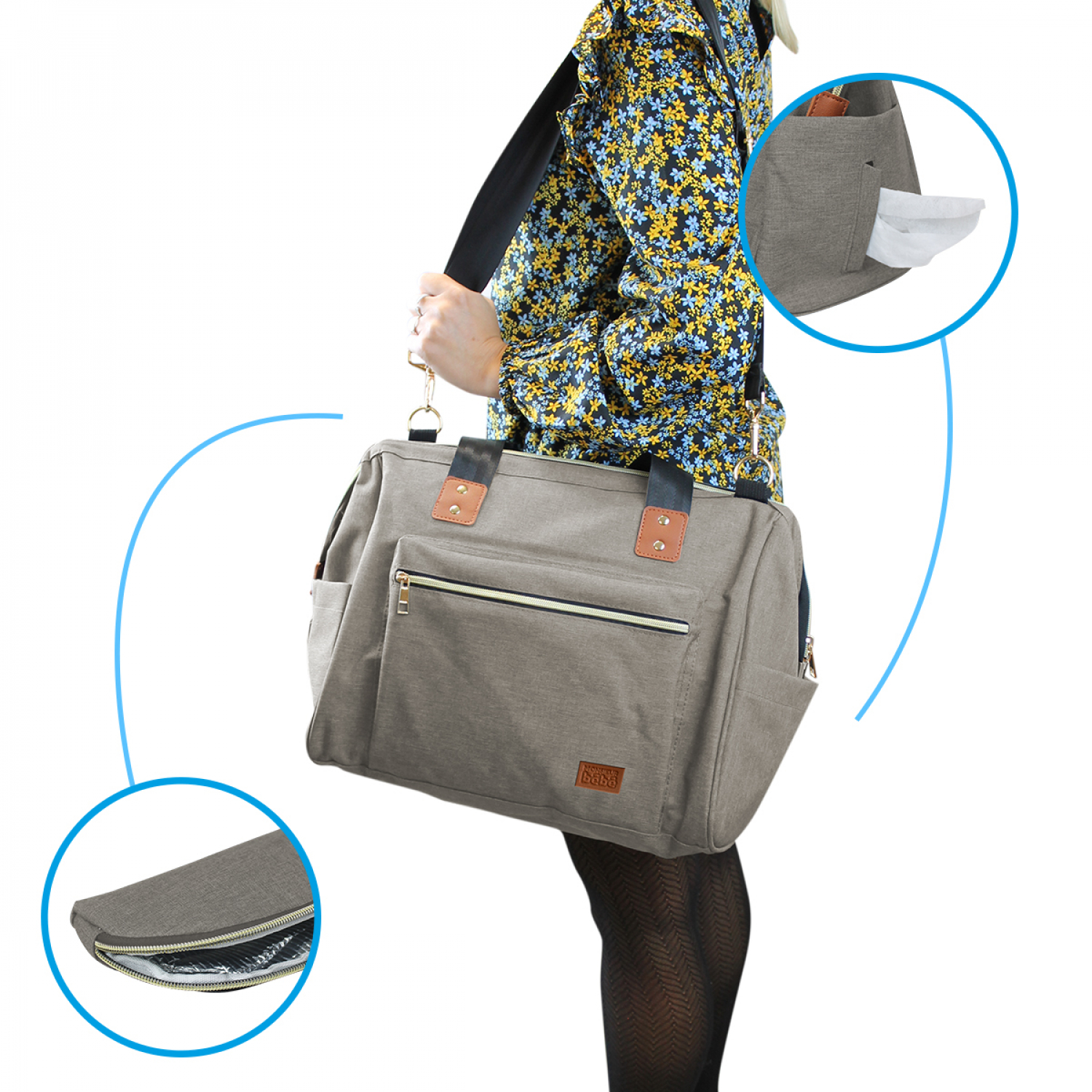 Le sac à langer peut se porter en bandoulière ou à la main.