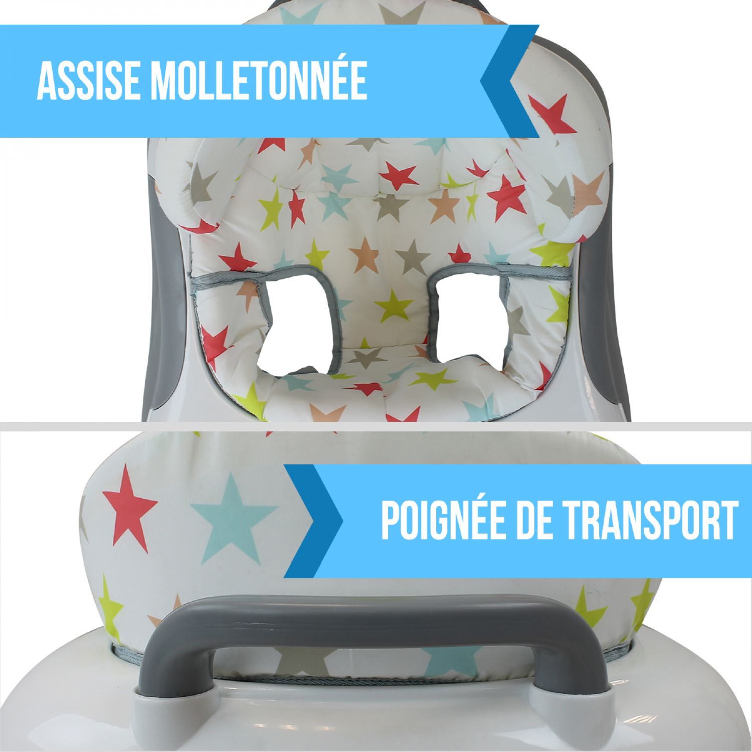 Design et sécurisant le trotteur « Stars » de Monsieur bébé est le parfait allié de l'évolution de votre enfant. Il dispose d'une structure réglable sur 3 positions 49 cm (hauteur 1), 52 cm (hauteur 2), 55 cm (hauteur 3) afin de suivre la croissance de bébé. Muni de 4 roues dont 2 directrices et d'une assise rembourrée, il est très confortable. Le trotteur « Stars » est doté d'une tablette d'éveil musicale amovible de 5 mélodies et ludique (divers jouets), pour stimuler la sensibilité visuelle et tactile de votre enfant. L'âge minimum requis est de 6 mois et le poids maximum est de 12 Kg. L'Assise est détachable et lavable à la main uniquement. La Base du trotteur est anti-chute avec patin de sécurité. Il est facilement transportable grâce à sa poignée. Les matériaux sont pour la structure Acier, Polypropylène et ABS et pour le Tissu, Polyester pongé. Le Revêtement est 100% polyester. Pour la tablette il faudra 2 piles x 1.5 V -Type LR6 AA (Non incluses). Le trotteur Monsieur Bébé est conforme à la norme NF EN 1273.