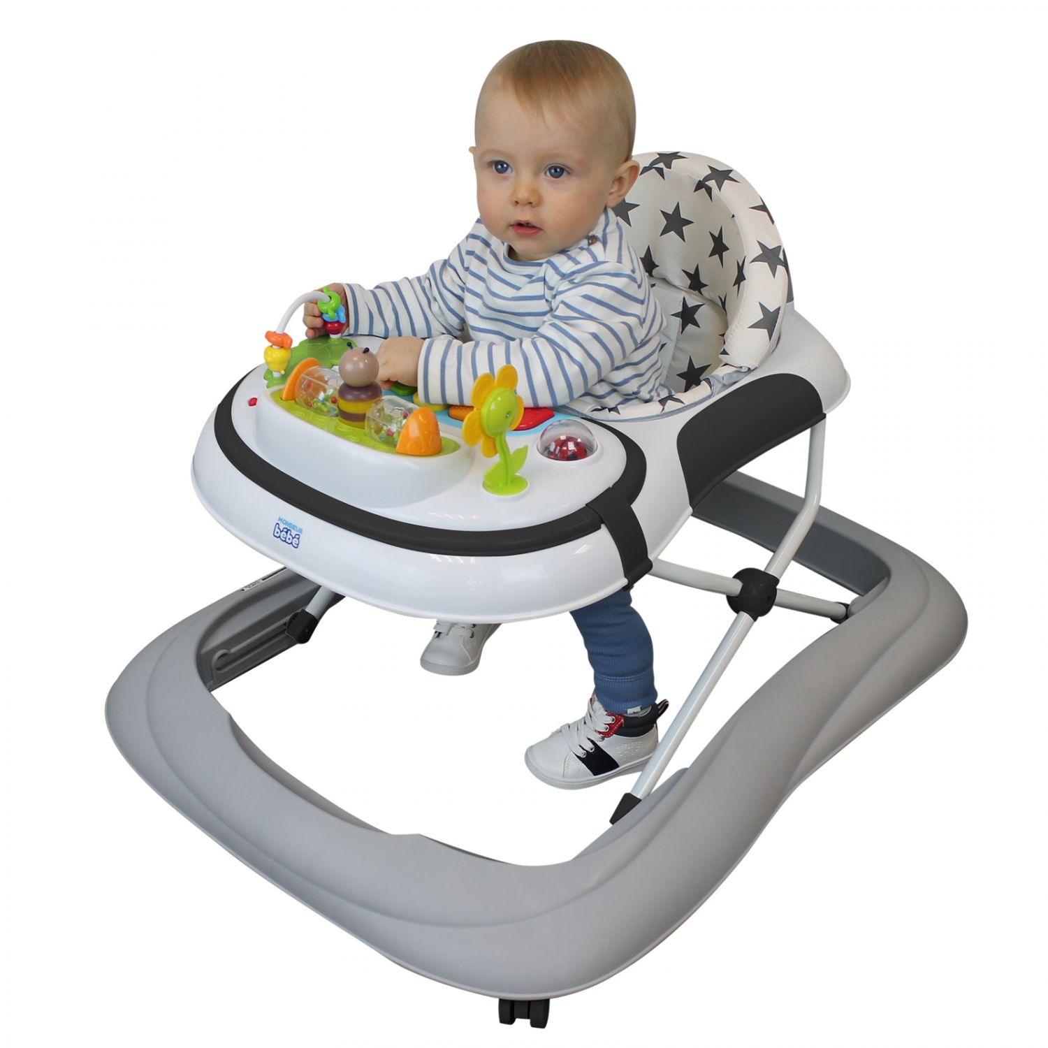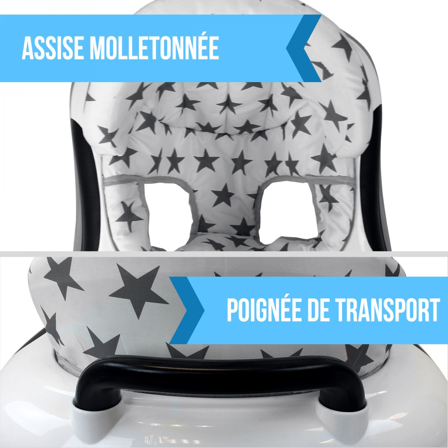 Design et sécurisant le trotteur « Stars » de Monsieur bébé est le parfait allié de l'évolution de votre enfant. Il dispose d'une structure réglable sur 3 positions 49 cm (hauteur 1), 52 cm (hauteur 2), 55 cm (hauteur 3) afin de suivre la croissance de bébé. Muni de 4 roues dont 2 directrices et d'une assise rembourrée, il est très confortable. Le trotteur « Stars » est doté d'une tablette d'éveil musicale amovible de 5 mélodies et ludique (divers jouets), pour stimuler la sensibilité visuelle et tactile de votre enfant. L'âge minimum requis est de 6 mois et le poids maximum est de 12 Kg. L'Assise est détachable et lavable à la main uniquement. La Base du trotteur est anti-chute avec patin de sécurité. Il est facilement transportable grâce à sa poignée. Les matériaux sont pour la structure Acier, Polypropylène et ABS et pour le Tissu, Polyester pongé. Le Revêtement est 100% polyester. Pour la tablette il faudra 2 piles x 1.5 V -Type LR6 AA (Non incluses). Le trotteur Monsieur Bébé est conforme à la norme NF EN 1273.