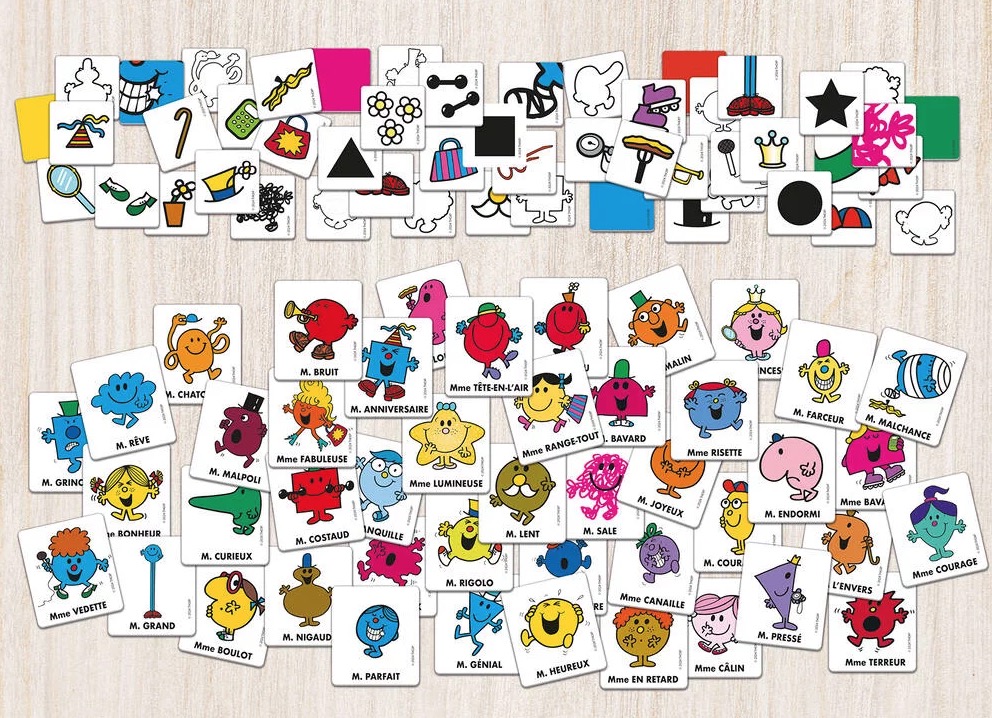 Les joueurs mettront à l´épreuve sa rapidité visuelle et son sens de l´observation dans ce jeu de cherche et trouve dans l´univers des Monsieur Madame. Un jeu tout-en-un accessible dcs les 4 ans. Il peut etre joué à n´importe quel âge, y compris avec les plus grands ! doivent chercher et trouver les accessoires, les formes et les couleurs des Monsieur Madame. Il peut etre joué seul mais aussi à plusieurs et il est complctement collaboratif : le but est de trouver les couleurs, formes, accessoires, silhouettes et les images reliées aux personnages et le plus vite possible ! Contenu : Cartes avec les personnages MONSIEUR MADAME, jetons avec des images d´accesoires, jetons avec formes, jetons avec les couleurs, jetons avec les silhouettes, instructions.