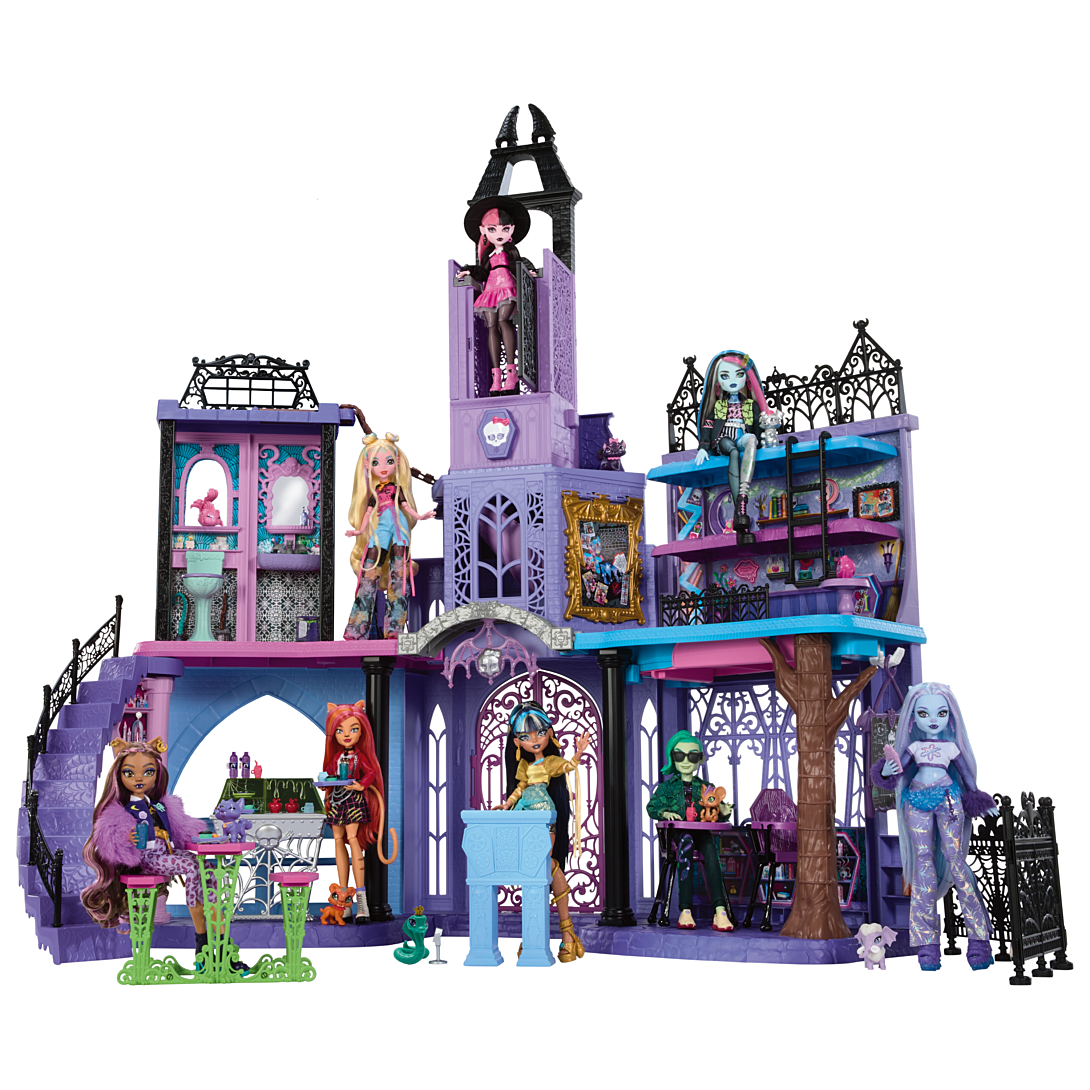La boîte contient Inclut 1 maison de poupée Monster High (à assembler), 1 table à manger, 1 comptoir de cafétéria, 2 chaises de bureau, 1 podium, 1 portail et plus de 30 éléments de jeu. Poupées non incluses. Les couleurs et les décorations peuvent varier.