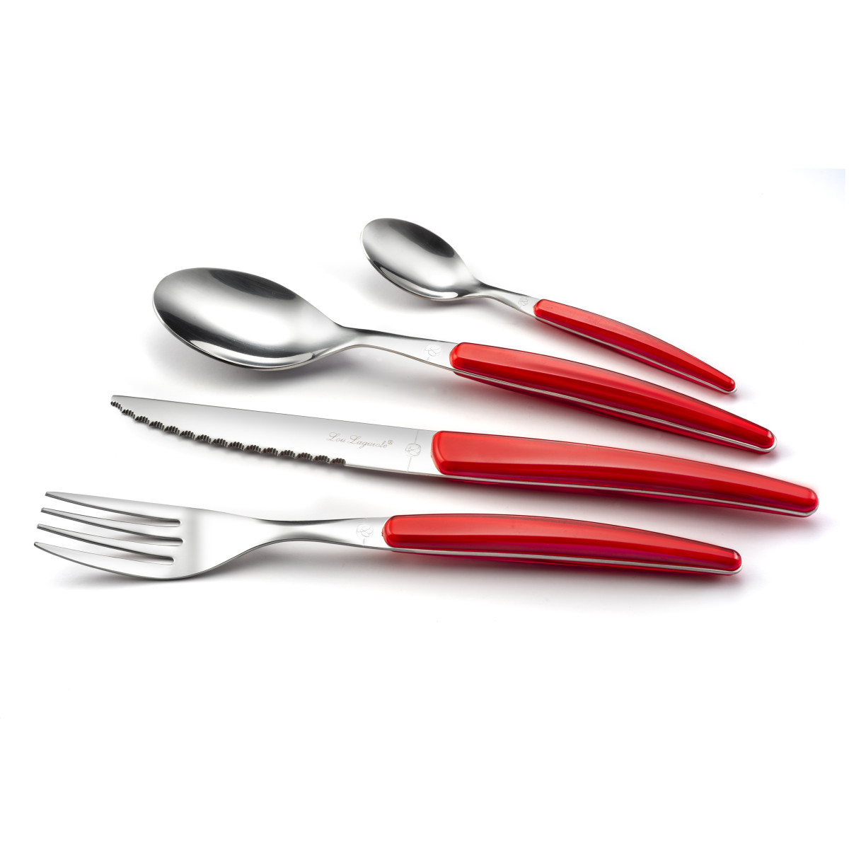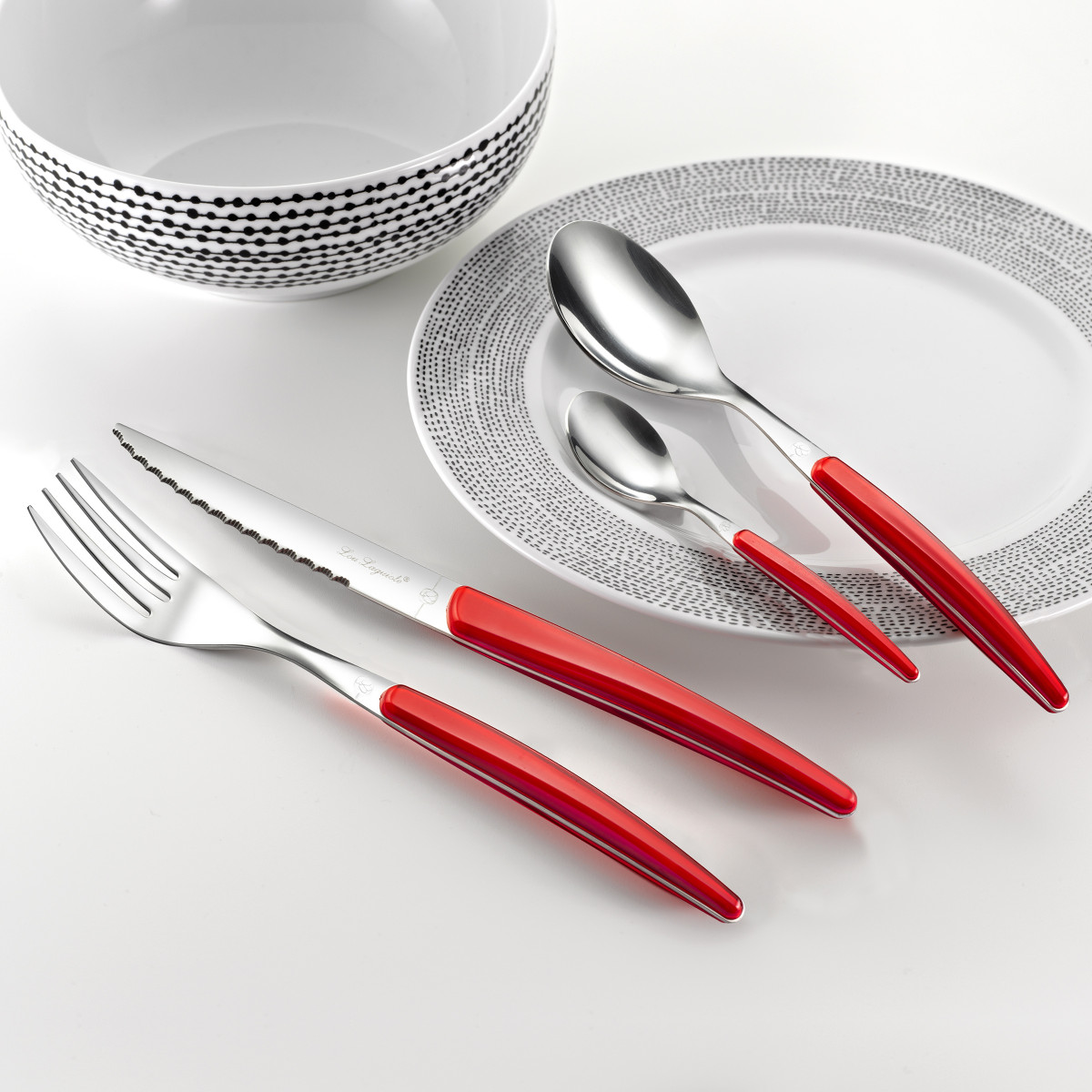 Ensemble de 24 couverts Lou Laguiole pour 6 personnes de la gamme Montana. Manche cristallin de couleur rouge. Lame inox microdentée en acier inoxydable, finition polie brillante.