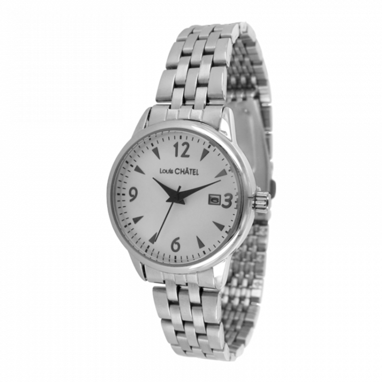 Montre Louis Chatel, boitier en alliage chromé, cadran chromé, bracelet acier chromé, mouvement quartz, analogique, dateur, étanche 50 m, verre minéral, boucle clip.