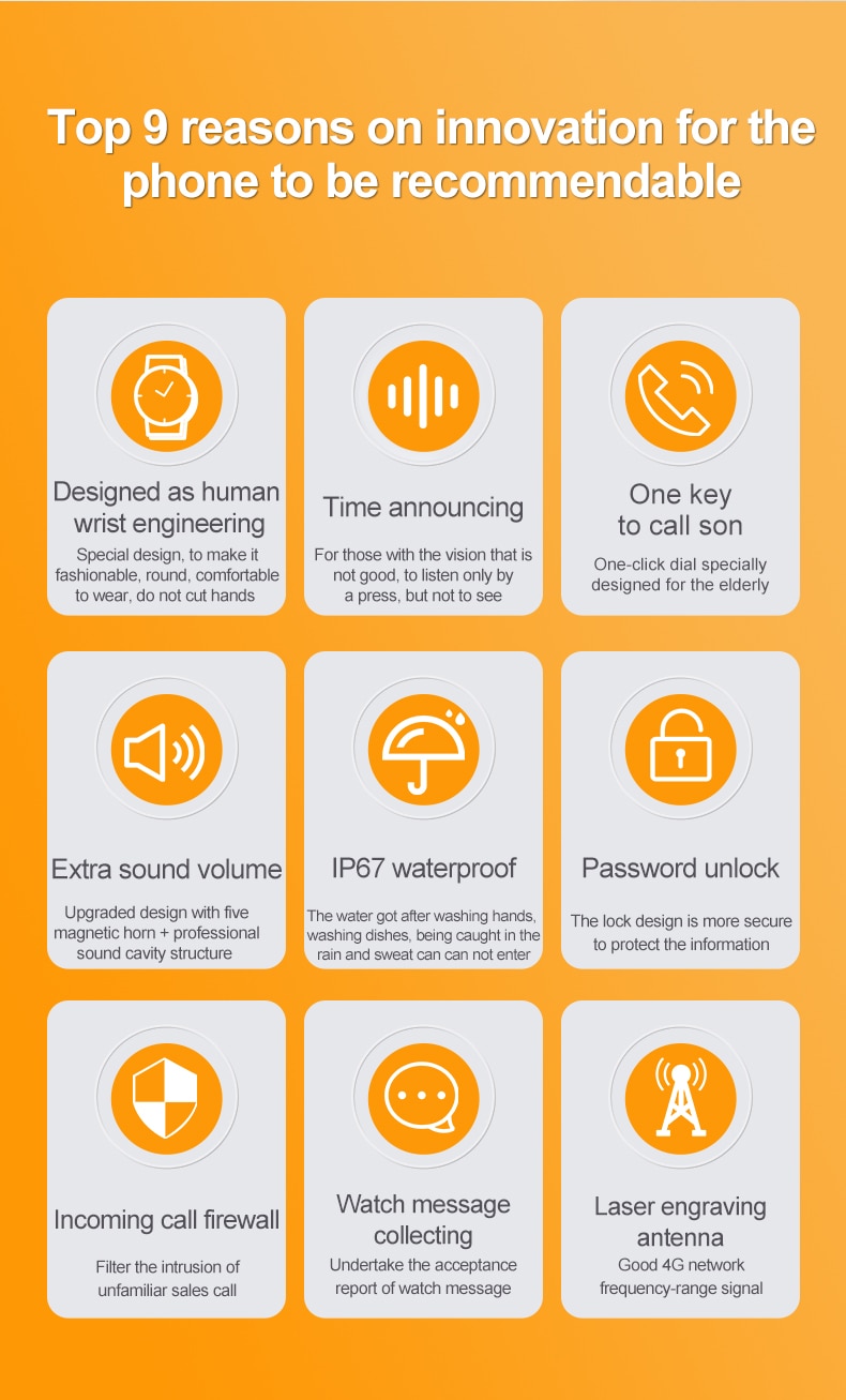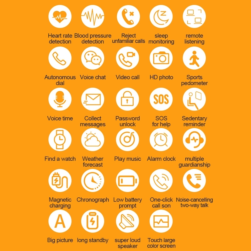 • Fonctions : Détection de la fréquence cardiaque, rappel médical, suivi de la condition physique, moniteur de sommeil, positionnement GPS+LBS+WIFI, numéro SOS en 1 clic, clôture électronique, historique, alarme anti chute etc.
