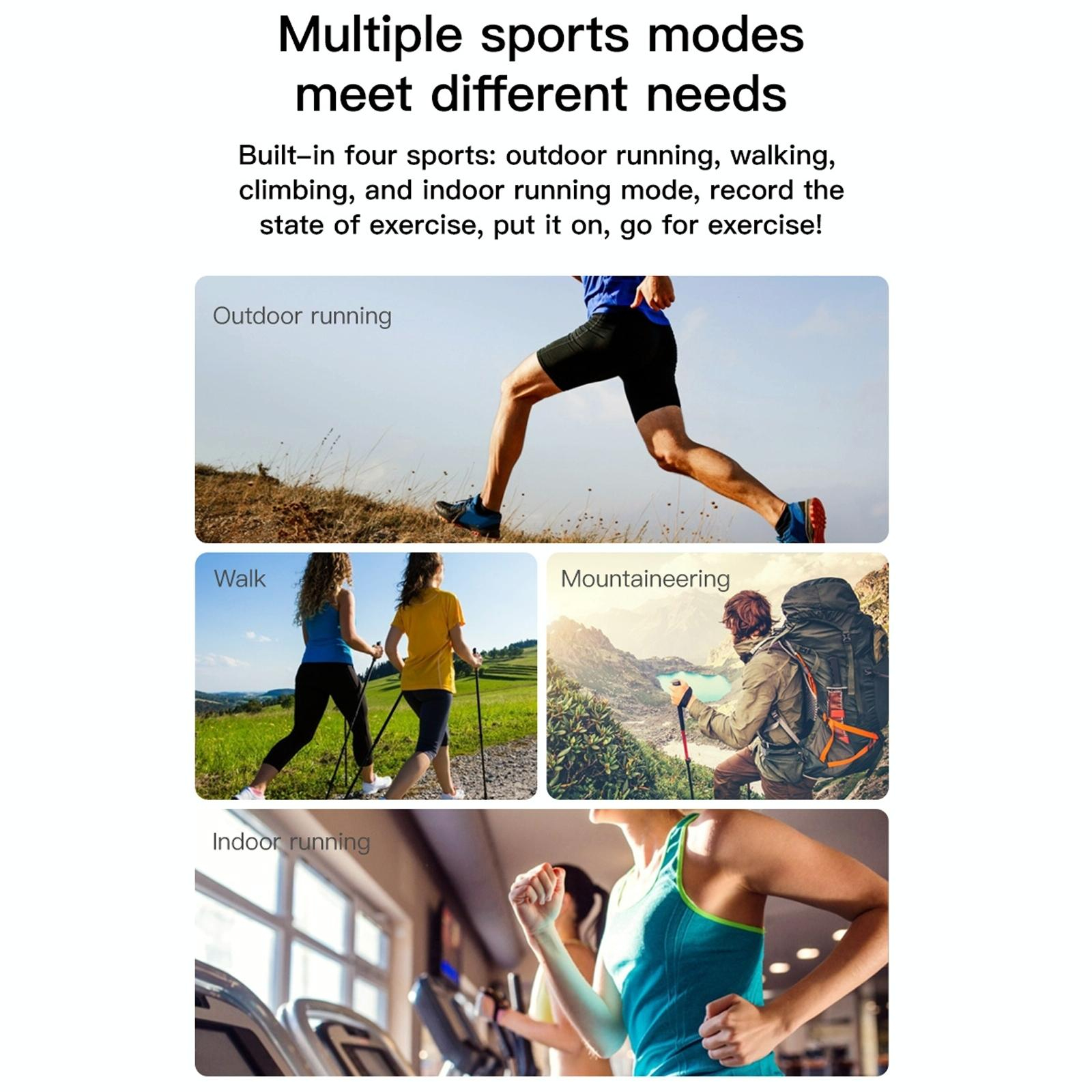 - Fonctions principales : Appels Bluetooth, réception et émission d'appels, répertoire, historique des appels, notifications, enregistrement d'activité, suivi de la fréquence cardiaque, surveillance de la pression artérielle, entraînements physiques, rappels d'inactivité, lecture de musique Bluetooth, suivi du sommeil, rappels de notification, gestion des fichiers, paramètres, enregistrement, réveil, chronomètre, caméra à distance, recherche du téléphone, calendrier, calculatrice, rappels d'information, etc.