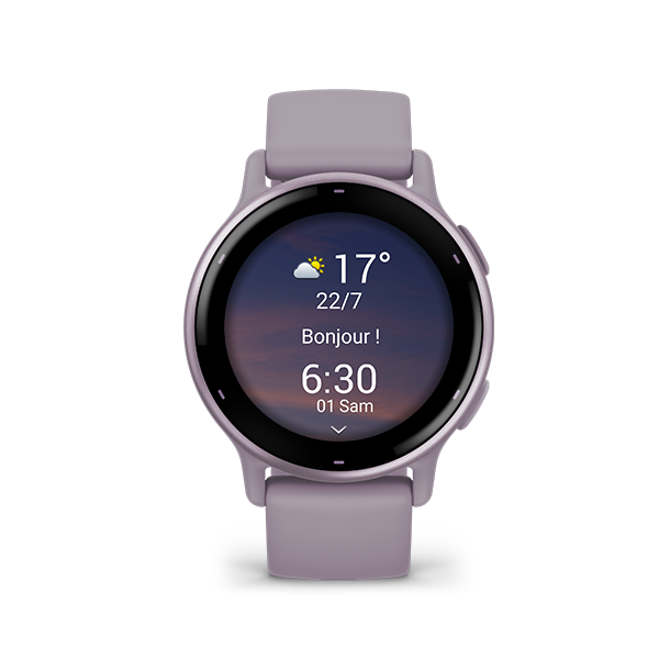 Garmin Vivoactive 5. Taille de l'écran: 3,05 cm (1.2"), Technologie d'affichage: AMOLED, Résolution de l'écran: 390 x 390 pixels, Écran tactile. Memoire flash: 4 Go. Wifi. GPS (satellite). Poids: 36 g. Matière de la bande: Silicone, Couleur du bracelet: Violet, Taille du bracelet: Taille unique