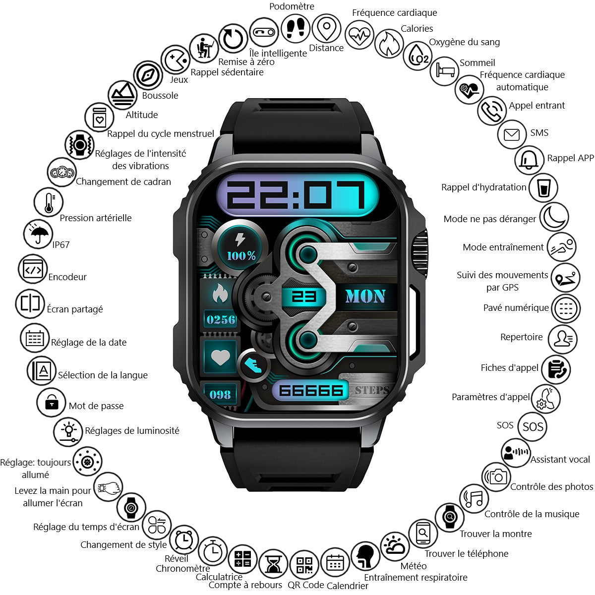 • Montre Connectée Bluetooth • La montre connectée Bluetooth est la fusion parfaite de style, d'innovation et de fonctionnalité. Conçue pour s'adapter à votre vie active tout en ajoutant une touche d'élégance à votre poignet, cette montre intelligente est bien plus qu'un simple accessoire de mode. Elle est votre compagnon ultime pour une vie plus saine et plus connectée. • Fonctionnalités Principales : • Podomètre : Suivez précisément vos pas tout au long de la journée et fixez-vous des objectifs pour rester actif. • Surveillance Cardiaque : Contrôlez votre fréquence cardiaque en temps réel pour une meilleure compréhension de votre santé cardiovasculaire. • Surveillance du Sommeil : Obtenez des informations sur la qualité de votre sommeil. • Surveillance de la Pression Artérielle (BP) : Mesurez votre tension artérielle et suivez son évolution. • SPO2 : Mesurez le niveau d'oxygène dans le sang pour surveiller votre santé respiratoire. • Mode Sport : Choisissez parmi une variété de modes sportifs pour suivre vos performances lors de vos activités physiques préférées. • Appel Bluetooth : Recevez et passez des appels directement depuis votre poignet, vous permettant de rester connecté où que vous soyez. • Répertoire : Accédez à vos contacts directement depuis la montre pour un accès facile à vos proches. • Contrôle Caméra : Utilisez votre montre pour prendre des photos à distance, idéal pour les selfies de groupe sans trépied. • Minuteur : Gérez efficacement votre temps avec une fonction minuterie intégrée. • Calculatrice : Effectuez des calculs rapides sans sortir votre téléphone de votre poche. • Météo : Consultez les prévisions météorologiques locales en temps réel pour planifier vos activités en conséquence. • Inclus dans le pack : • 1x Montre connectée • 1xChargeur • 1xNotice