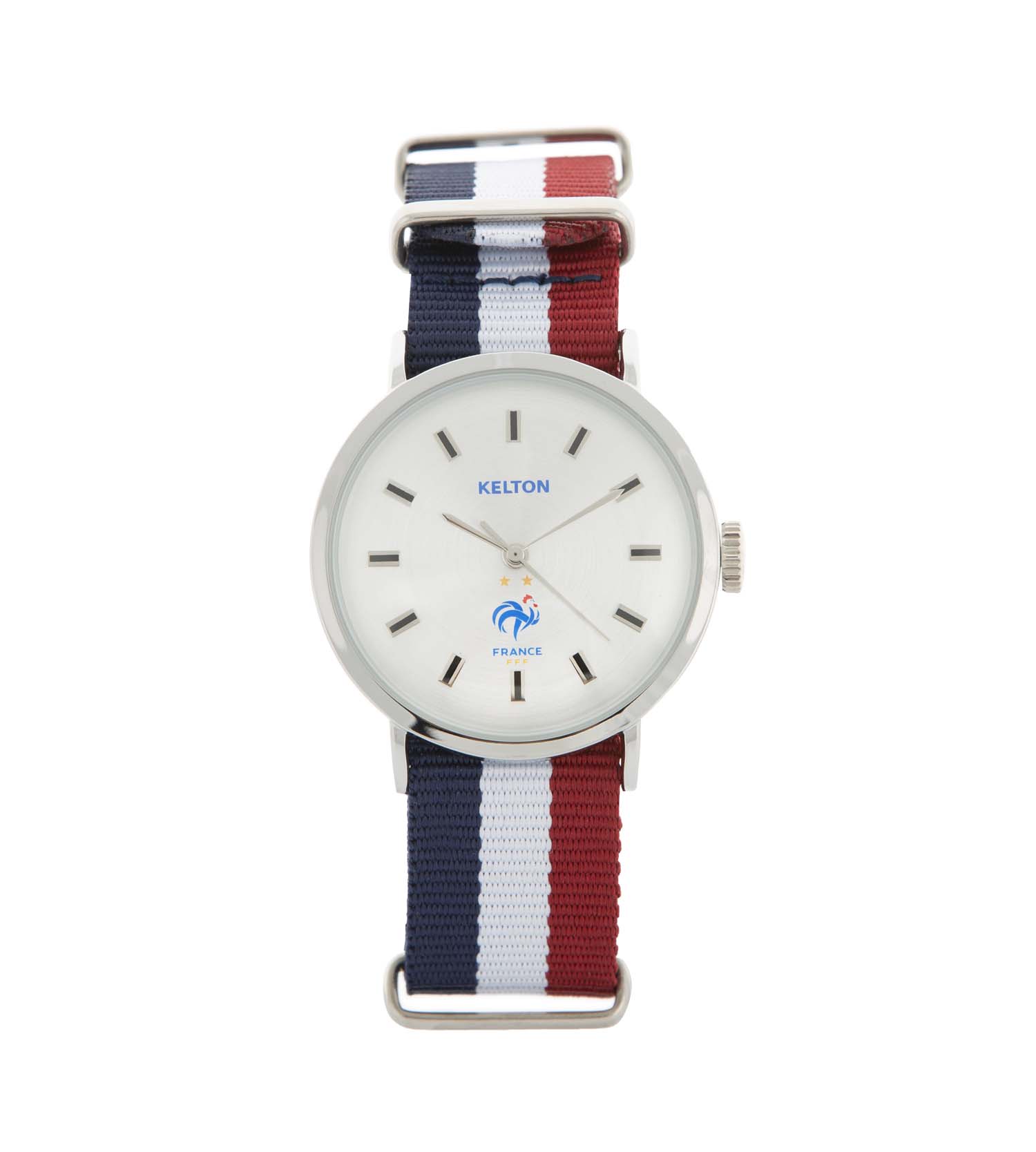Avec son bracelet nato aux couleurs du drapeau français, porté fièrement la montre "FRANCE" à votre poignet. Dans son cadran, la marque Equipe de France est présente avec les signes distinctifs "deux étoiles", "Coq","FRANCE" et "FFF". Sur le dos de la montre, les deux dates emblématiques de la victoire de la France sont gravées :"12 juillet 1998" et "15 juillet 2018".