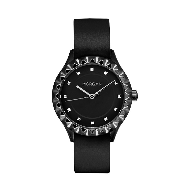 Montre ronde en métal acier de marque Morgan au boitier orné de strass, mouvement à quartz 3 aiguilles, cadran noir, boitier de 36 mm de diamètre, verre minéral, fond acier, bracelet en cuir noir fermé par une boucle ardillon, étanche à 30 mètres, ne doit pas être immergée, garantie 2 ans