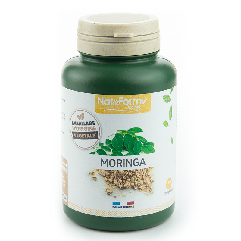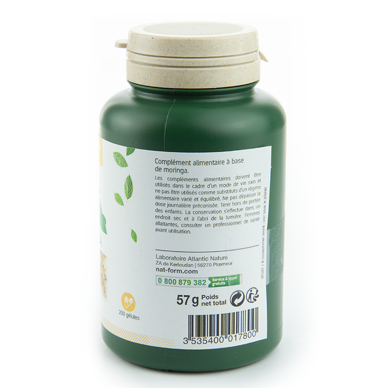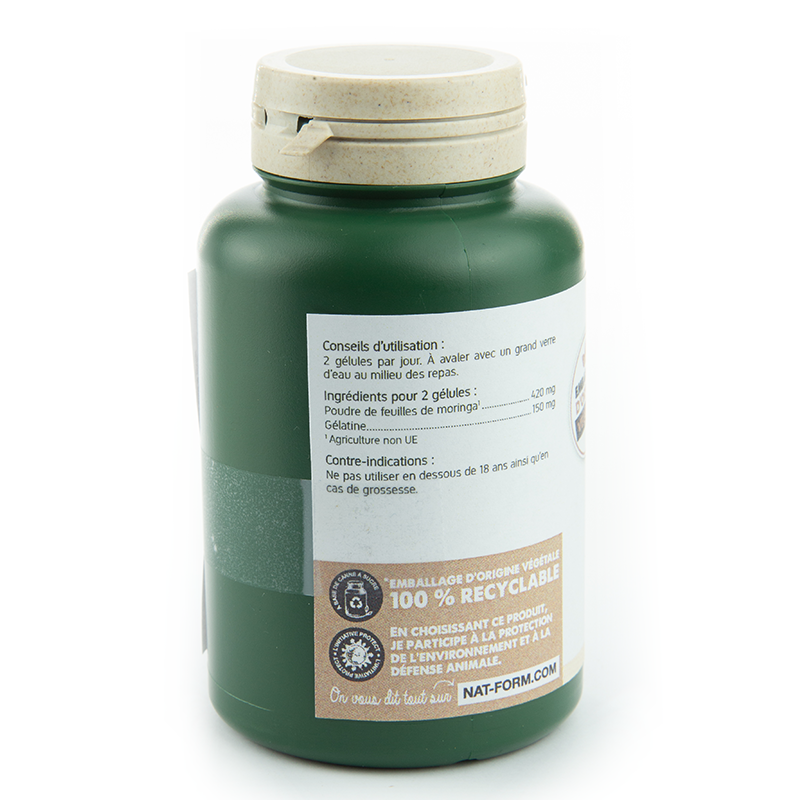 Ingrédients pour 6 gélules : Poudre de graines de moringa 1260 mg Gélatine 450 mg