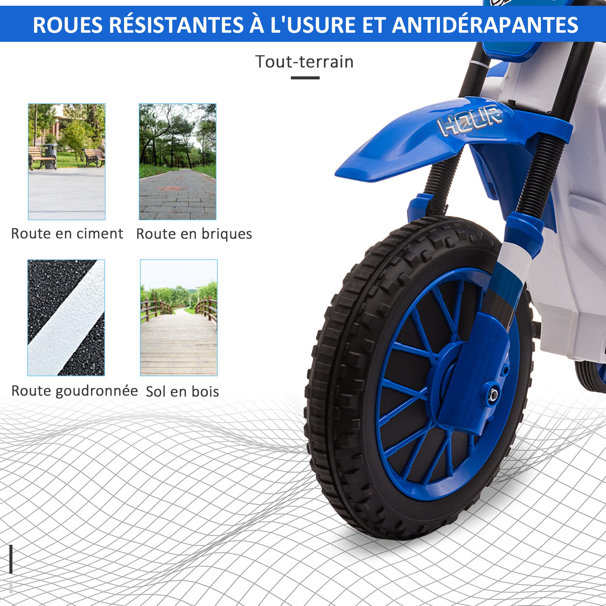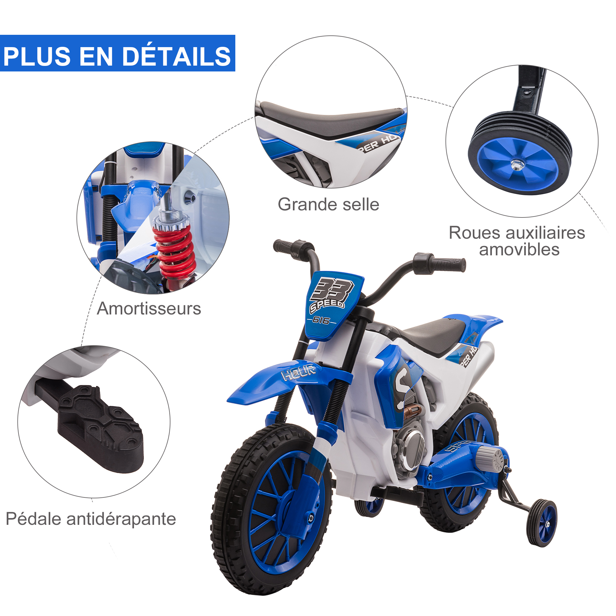 Libellé Moto cross électrique enfant 3 à 5 ans 12 V 3-8 Km/h avec roulettes latérales amovibles dim. 106,5L x 51,5l x 68H cm bleu
