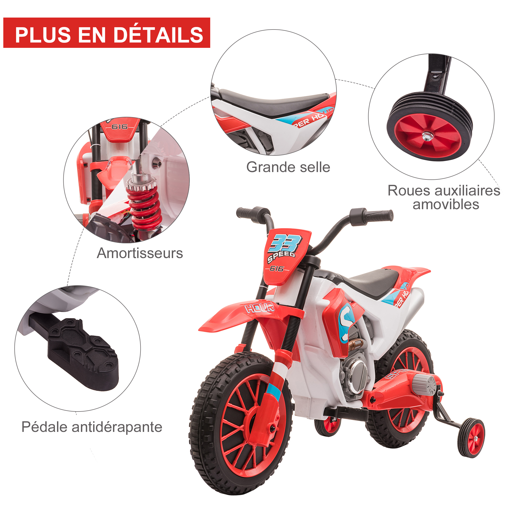 | Libellé | Moto cross électrique enfant 3 à 5 ans 12 V 3-8 Km/h avec roulettes latérales amovibles dim. 106,5L x 51,5l x 68H cm rouge |