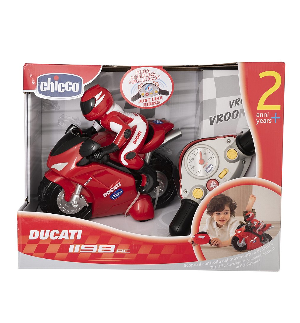 1ère Moto Ducati radiocommandée à conduite intuitive! Tourne la télécommande en forme de guidon pour choisir ta direction. Effets sonores réalistes.