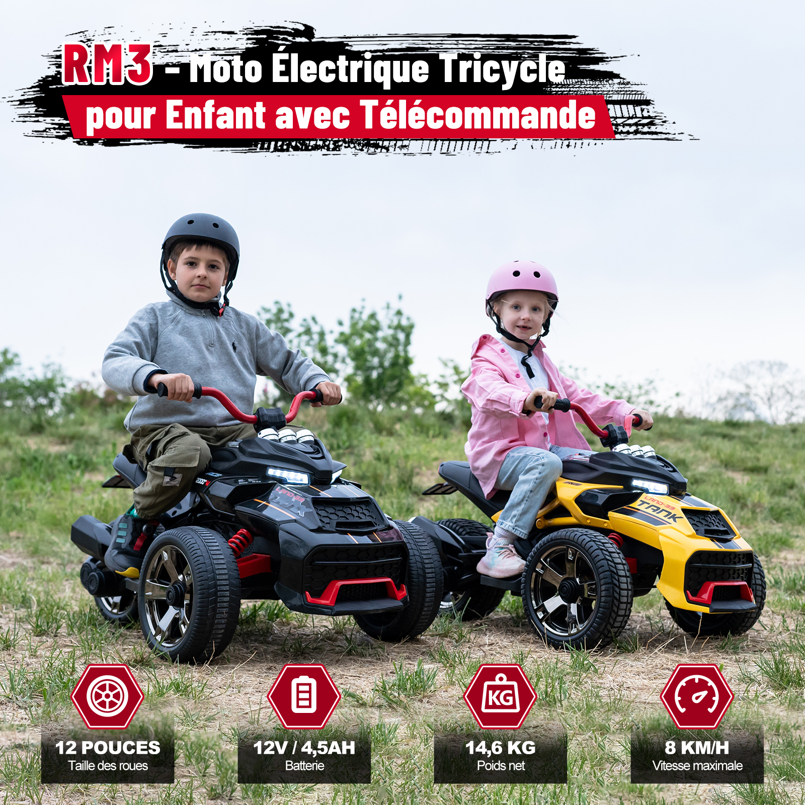 Passer le carrousel d'imagesOffrez à votre enfant une expérience de conduite améliorée avec la moto électrique tricycle RM3. Avec ses deux vitesses, suspension avant/arrière, fonction Bluetooth et ses grandes roues de 12 pouces, ce véhicule électrique combine confort, stabilité et plaisir. Idéale pour les enfants de 3 à 8 ans, la RM3 est pensée pour allier sécurité et sensations fortes en toute confiance.