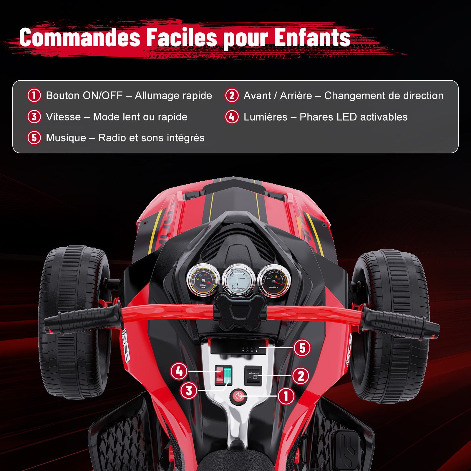 | Libellé | Moto Électrique Enfant Tricycle RCB - 3 Roues - Double Vitesse - Bluetooth - Double Moteur - Batterie 12V - Suspension - RM3 Rouge |