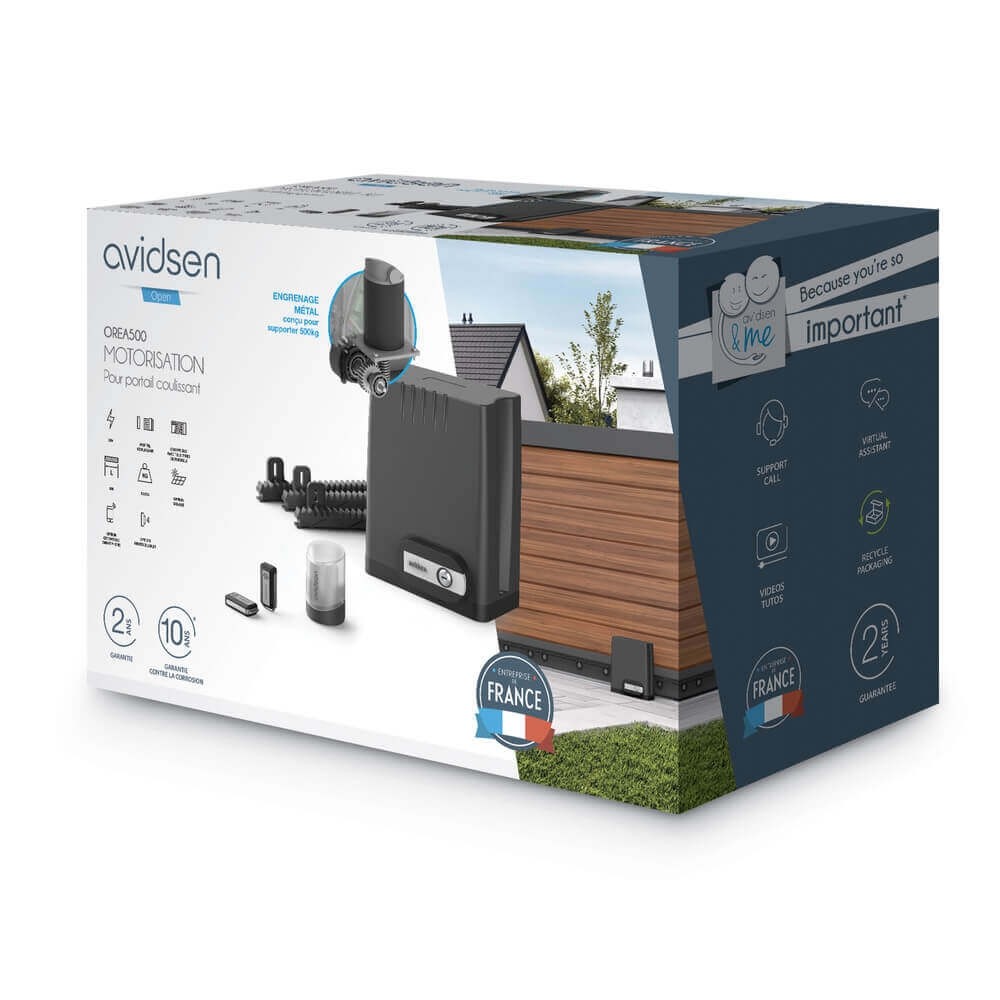 KIT MOTORISATION OREA500 Pour portails coulissantL'OUVERTURE DE VOTRE PORTAIL COULISSANT N'AURA JAMAIS ÉTÉ AUSSI FACILELa motorisation pour portail coulissant dernière génération d'Avidsen permet de reproduire le mouvement naturel du portail et d'allonger sa durée de vie. Cette motorisation rapide et silencieuse, dotée d'une ouverture progressive et d'un ralenti à la fermeture vous ravira de part son design sobre et élégant. Elle vous permet d'ouvrir un portail jusqu'à 8m et 500kg, en cas de panne d'Électricité, la clé de débrayage manuel vous permettra d'ouvrir votre portail en toute sécurité.LES + PRODUITS Mise en route simple grâce à la fonction d'auto-apprentissage, la motorisation apprend et enregistre automatiquement votre configuration Plus de sécurité et de confort avec le ralenti fin de course et l'arrêt automatique en cas d'obstacleUne ouverture naturel pour votre portail pour une durée de vie accruePermet de commander des portails coulissant jusqu'à 8m et 500kgCette motorisation est compatible avec tous les types d'interphone audio/ vidéo du marché (ouverture du portail depuis l'interphone)Cette motorisation de portail est compatible avec le kit d'alimentation solaire réf. 114374 (en option, non inclus dans ce kit). Ce kit d'alimentation photovoltaïque permet à votre motorisation de fonctionner grâce à l'énergie solaire sans recours au secteur 230VAC CONTENU DU KIT1 moteur 24VDC avec électronique intégrée2 télécommandes 433,92 MHz à 4 boutons1 feu clignotant8 crémaillères de 50cm (soit 4m)FONCTIONNALITÉSPour tout type de portail coulissant : bois, fer, alu et PVCDimensions et poids : 8 mètres/500 Kg maxiOuverture vers la droite ou vers la gaucheDéverrouillage manuel du moteurFermeture du portail automatique (après temporisation) ou semiautomatique (on referme le portail en appuyant sur la télécommande)Démarrage progressif et ralenti fin de courseRéglage de la force, vitesse, accélérationSécurité : arrêt sur obstacle et retour arrièrePassage piéton : ouverture partielle du portail