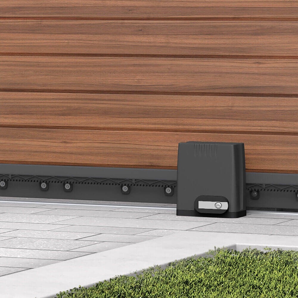 | Plus produit | Mise en service aisée grâce à la fonction d'auto-apprentissage : le système d'actionnement apprend et mémorise automatiquement ses réglages Pour portail coulissant jusqu'à 8 mètres et 500 kg Pour portail coulissant jusqu'à 8 mètres et 500 kg Compatible avec le kit d'alimentation solaire (ref 114374) disponible à l'achat (non fourni) Ralenti fin de course et arrêt automatique en cas d'obstacle |