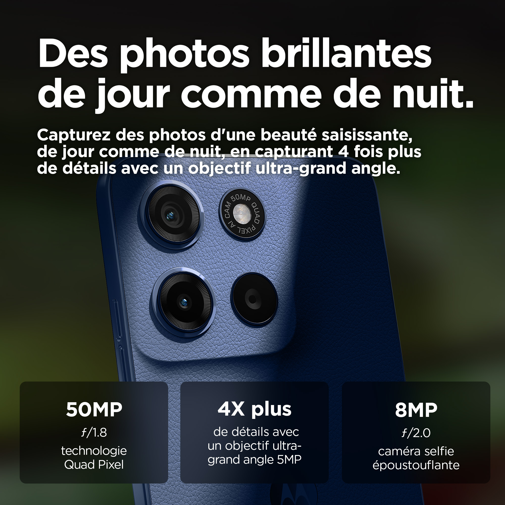 Le moto g15 vous offre le meilleur du divertissement cinématographique. Regardez vos émissions et films préférés sur un écran Full HD+ ultra net et lumineux de 6,72", même en plein soleil. Plongez dans un son multidirectionnel grâce aux puissants haut-parleurs stéréo avec Bass Boost et Dolby Atmos®. Capturez des photos magnifiquement détaillées avec l’appareil photo de 50 MP(1), éliminant les barres disgracieuses dues aux sources de lumière artificielle. Rechargez rapidement votre smartphone grâce au chargeur TurboPower™(2) et profitez d’une autonomie prolongée avec une batterie de 5 200 mAh. Le cuir vegan lui confère un style haut de gamme et son design résistant aux éclaboussures(3) et le verre Corning® Gorilla® Glass 3 renforcent sa protection. Bénéficiez de performances rapides et d’une grande capacité de stockage pour ne jamais être à court d’espace pour vos divertissements. Vivez chaque jour plus intensément avec le moto g15.