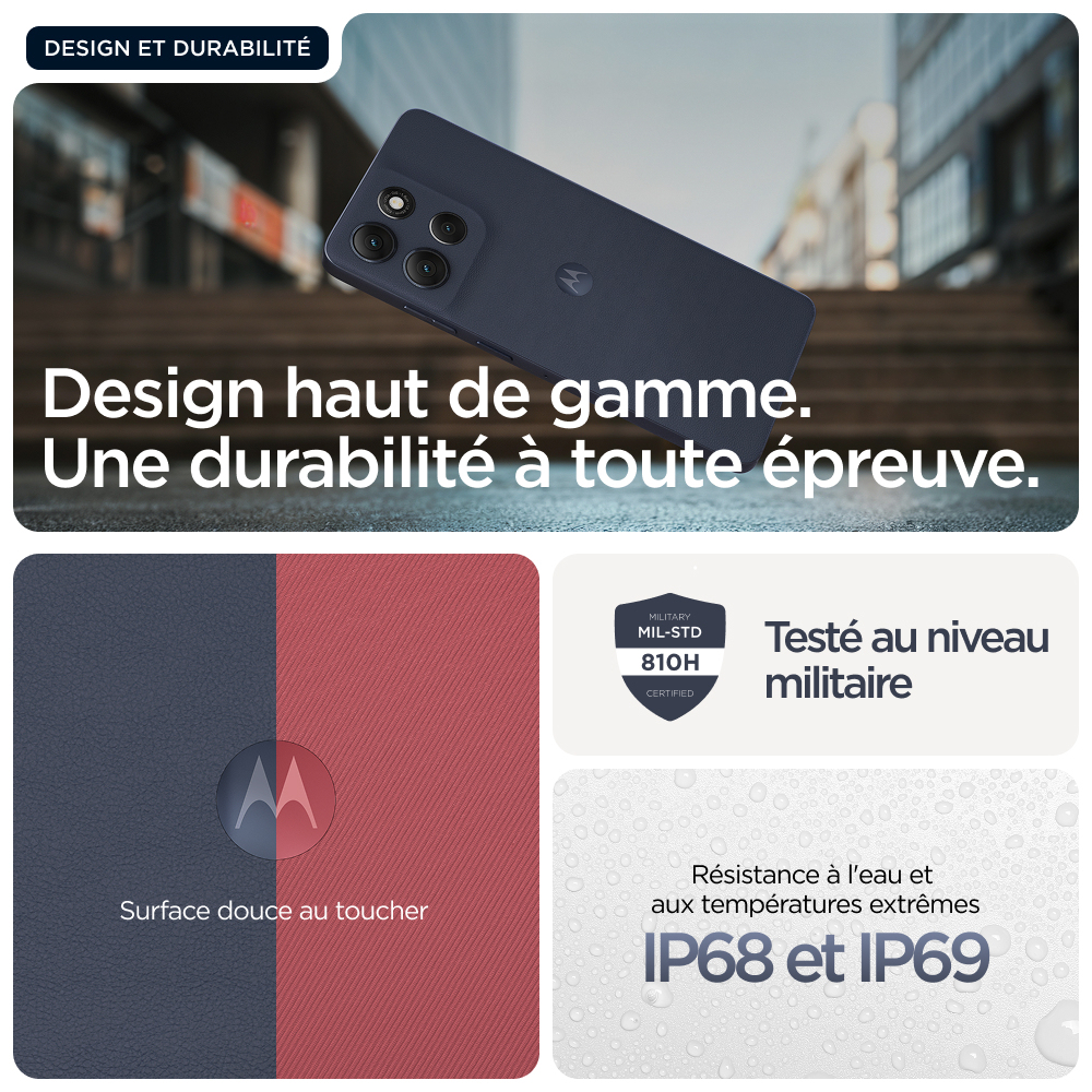 Découvrez le moto g86 5G, destiné à celles et ceux qui cherchent à repousser les limites. Soigneusement conçu à partir de matériaux de qualité, il se distingue par son design audacieux et une protection renforcée contre les éclaboussures et les chutes(6,7). Visualisez tous les contenus sur un écran Super HD (1220p) ultra lumineux de 6,67" accompagné du son Dolby Atmos®. Prenez des photos éblouissantes avec l’appareil photo Sony LYTIA™ 600 de 50 MP optimisé par moto ai(12) et capturez des images dignes d’un pro en toute facilité. Bénéficiez de plus de 41 heures d’autonomie en seulement quelques minutes grâce à la charge TurboPower™(1,13). Découvrez la puissance d’un processeur avancé, associée à 8 Go de RAM, extensible à 24 Go avec l’extension de RAM, et jusqu’à 256 Go d’espace de stockage(3,9). Laissez libre cours à votre créativité, interagissez sans effort et profitez d’une totale tranquillité d’esprit avec des expériences Moto exclusives. Vivez pleinement vos aventures avec le moto g86 5G.
