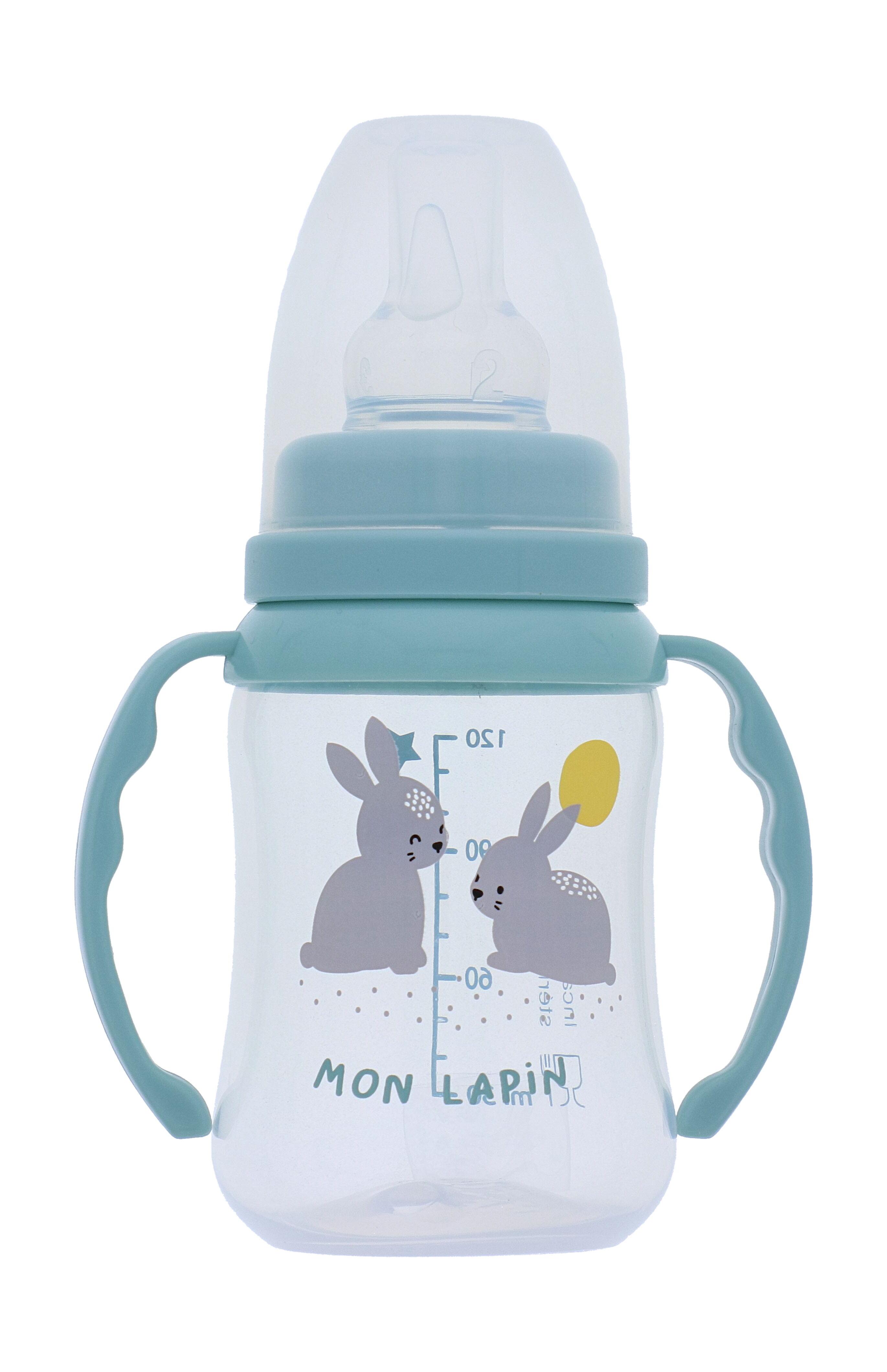 Biberon 120ml avec poignées mots d'enfants - Motif lapin