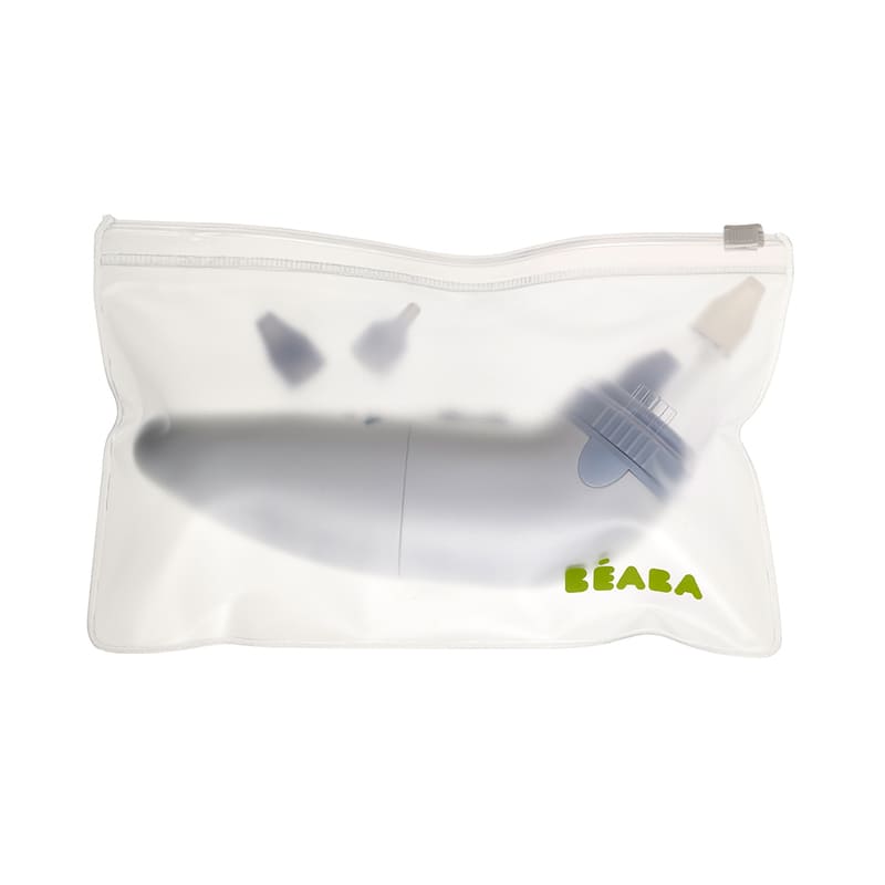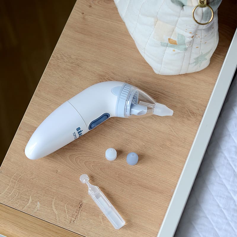 Mouche-bébé électrique évolutif nomade. Mouche bébé évolutif : Accompagne l'enfant dans sa croissance grâce à ses différents embouts. Aspiration en quelques secondes : Facilité accrue en obstruant la narine opposée. • Embout nourrison (0 à 3 mois) : Forme affinée . • Embout sécrétions normales et embout sécrétions épaisses : S'adaptent à l'évolution de l'emcombrement nasal de l'enfant. • Embout silicone : Matière souple et douce. • Tête amovible : Démontage et nettoyage facilités. Accessoires : Pochette de rangement. 3 embouts évolutifs stérilisables. Un joint en silicone supplémentaire. 2 piles LR6 (AA) (fournies) Entretien : Nettoyage facile avec un chiffon doux. Embouts stérilisables.