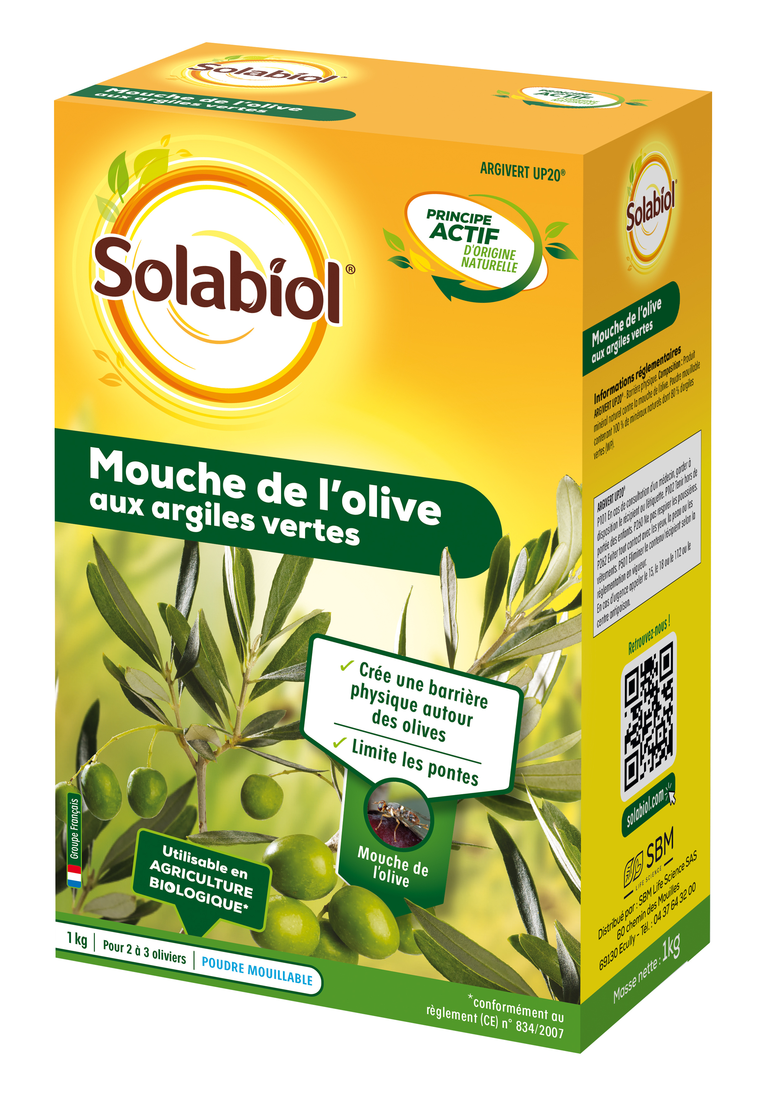 Le produit Mouche de l'olive Solabiol d’origine naturelle aux argiles vertes s'utilise comme barrière physique contre la mouche de l'olive. Il laisse après chaque passage une fine pellicule beige qui agit comme une barrière mécanique capable de limiter la ponte des mouches.